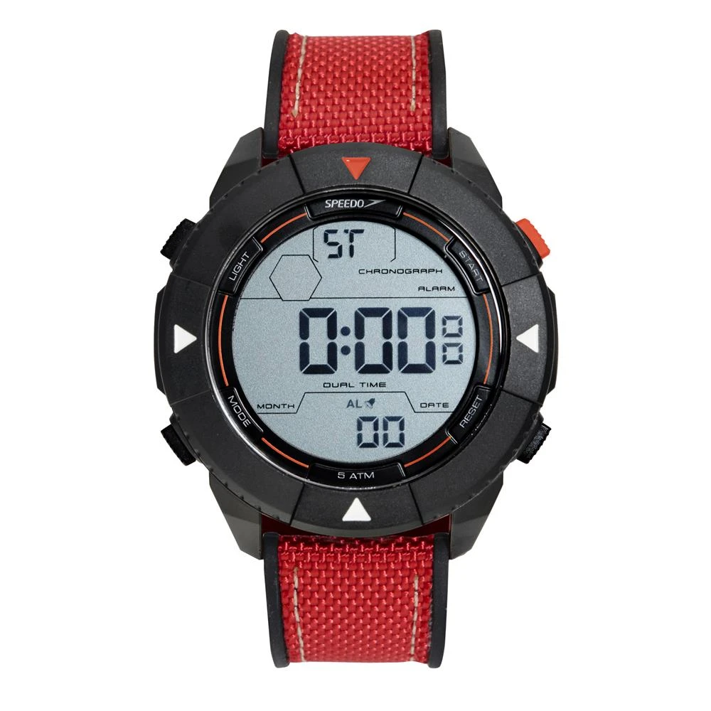 Funções: Digital, Iluminação, Alarme, Cronógrafo, Timer, Dual TimeResistência à Água: 50 mDiâmetro da Caixa: 51 mmCaracterísticas: com caixa em Policarbonato Preta e pulseira em Silicone Preto com detalhe em nylon vermelhoFundo ParafusadoVidro: AcrílicoAlimentação do Maquinário: BateriaGarantia de 1 ano