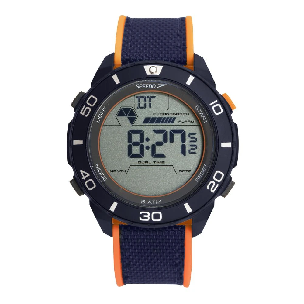 Funções: Digital, Iluminação, Alarme, Cronógrafo, Timer, Dual TimeResistência à Água: 50 mDiâmetro da Caixa: 51 mmCaracterísticas: com caixa em Policarbonato Azul e pulseira em Silicone Laranja com detalhe em nylon AzulFundo ParafusadoVidro: AcrílicoAlimentação do Maquinário: BateriaAro Fixo AzulGarantia de 1 ano