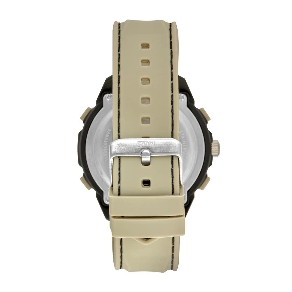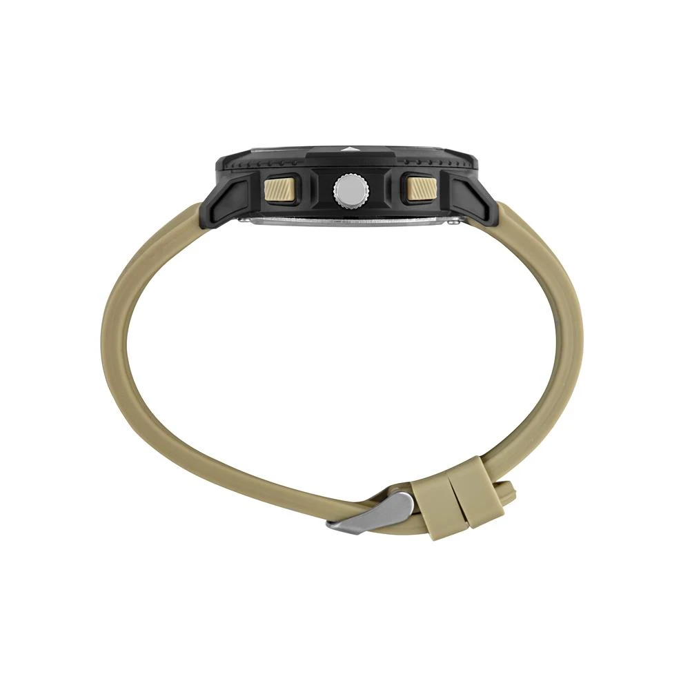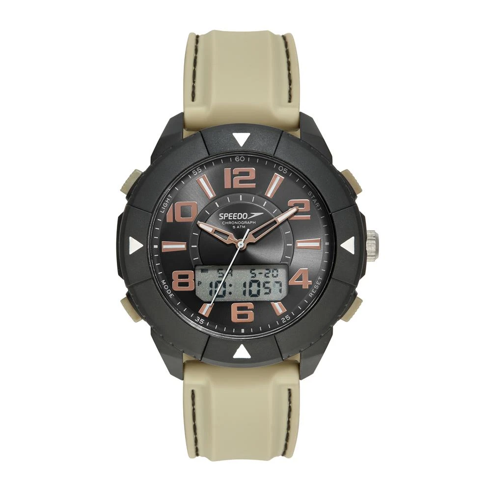 Funções: Anadigi, Iluminação, Alarme, CronógrafoResistência à Água: 50 mDiâmetro da Caixa: 50 mmCaracterísticas: com caixa em Policarbonato Preto e pulseira em Silicone CáquiFundo ParafusadoVidro: AcrílicoAlimentação do Maquinário: BateriaMostrador Grafite com Números e detalhes em roséGarantia de 1 ano