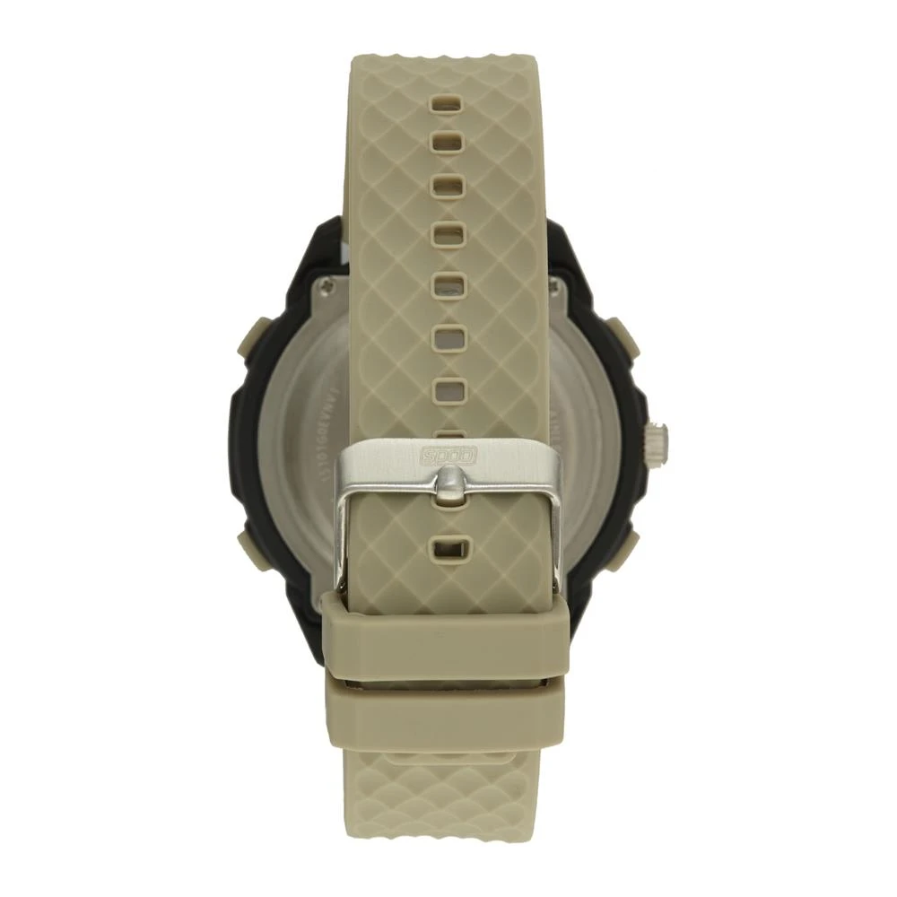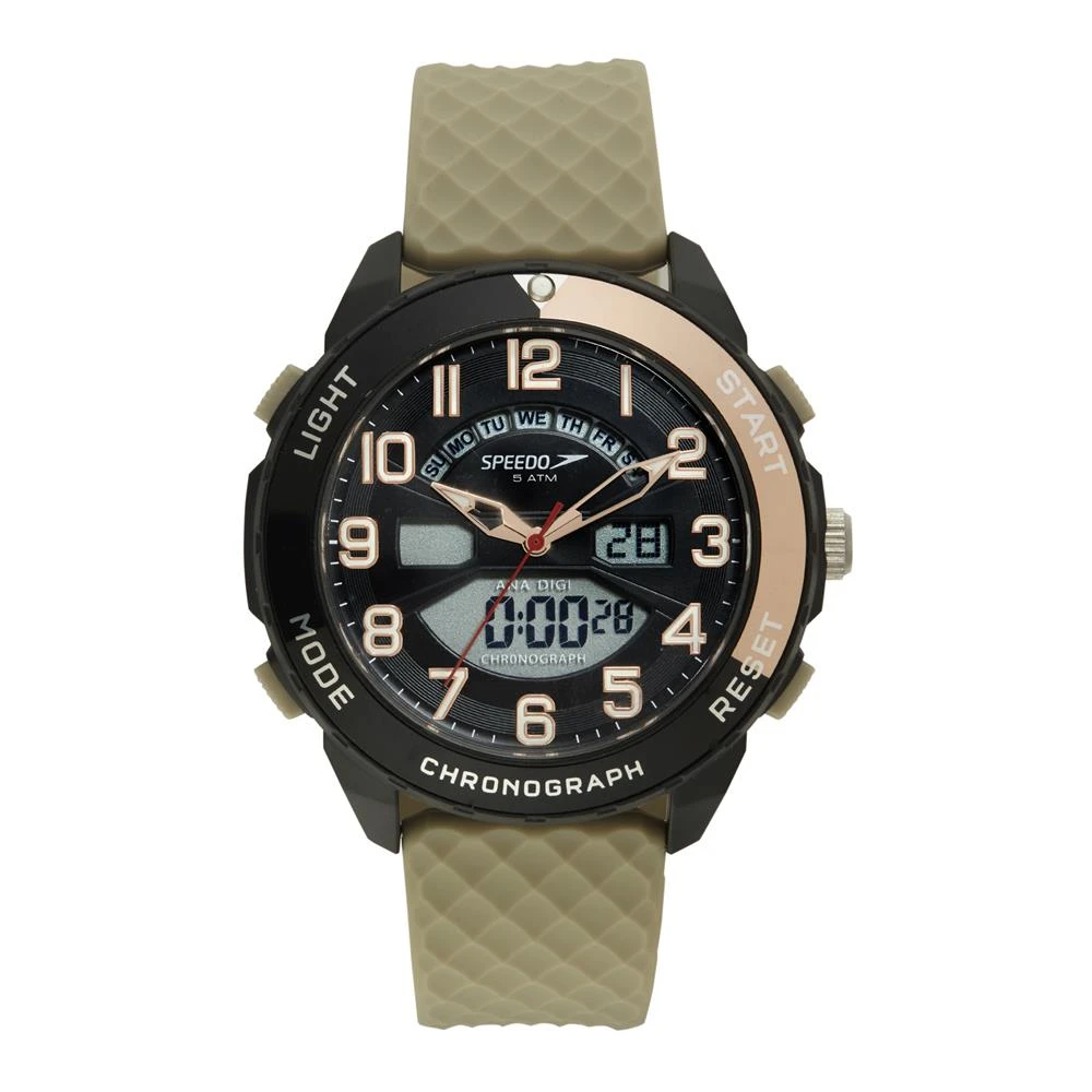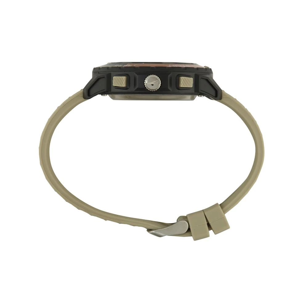 Funções: Anadigi, Iluminação, Alarme, CronógrafoResistência à Água: 50 mDiâmetro da Caixa: 51 mmCaracterísticas: com caixa em Policarbonato Preto e pulseira em Silicone cáquiFundo ParafusadoVidro: AcrílicoAlimentação do Maquinário: BateriaMostrador Preto com Todos os Números e detalhes em roséAro Fixo Preto com detalhes em roséGarantia de 1 ano