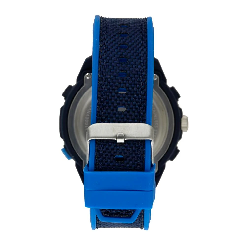 Funções: Anadigi, Iluminação, Alarme, CronógrafoResistência à Água: 50 mDiâmetro da Caixa: 51 mmCaracterísticas: com caixa em Policarbonato Azul e pulseira em Silicone Azul Claro com detalhe em tecido Azul EscuroFundo ParafusadoVidro: AcrílicoAlimentação do Maquinário: BateriaMostrador Prateado com Números e detalhes em azulAro Fixo Azul com númerosGarantia de 1 ano