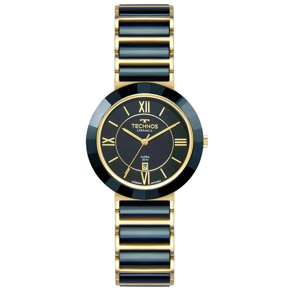 Caixa de Aço InoxPulseira de Aço Inox com detalhes em cerâmica azulFundo RosqueadoResistente à Água 5 AtmDiâmetro / Largura da Caixa: 34.00 MMVidro de SafiraFunções: Analógico, CalendárioMaquina JaponesaAlimentação do Maquinário: BateriaMostrador Azul com algarismos romanosAro Externo Fixo de Cerâmica Azul FacetadoGarantia de 1 Ano
