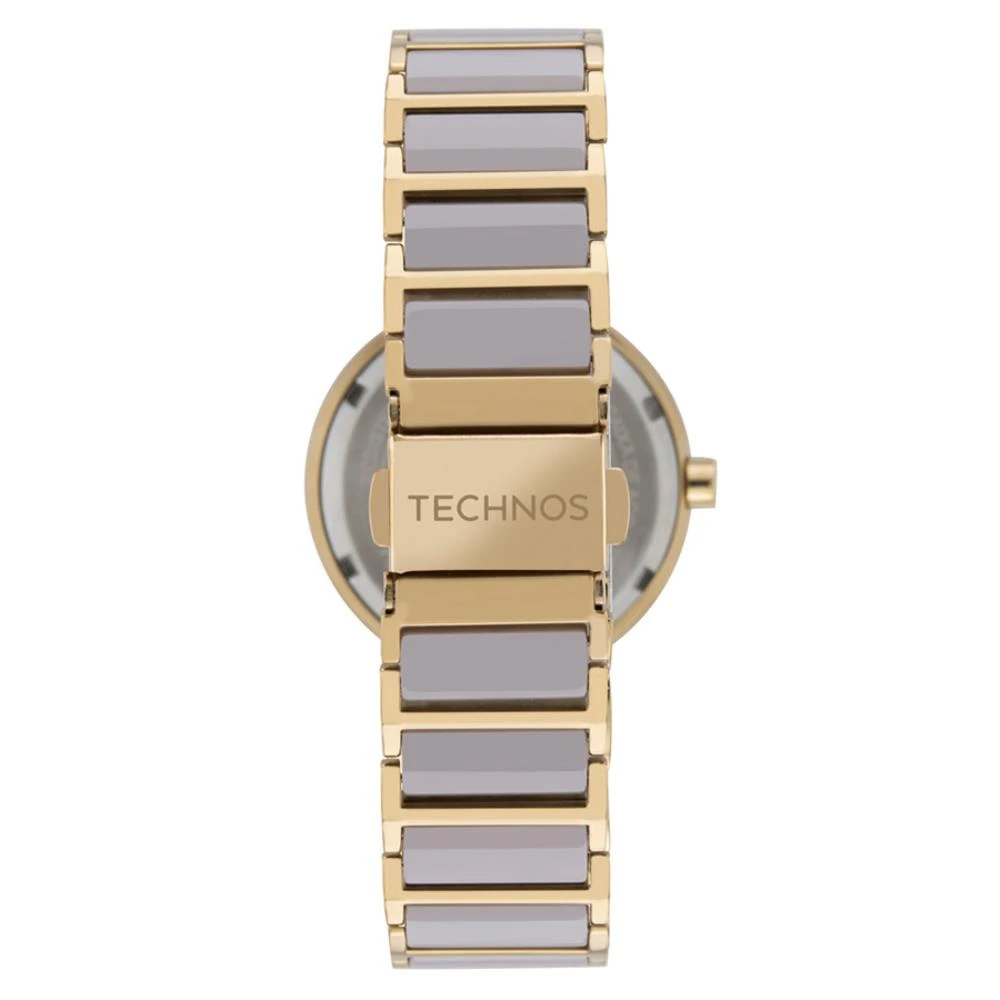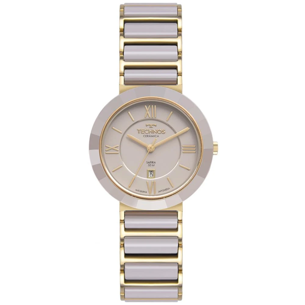 Caixa de Aço InoxPulseira de Aço Inox com detalhes em cerâmica nudeFundo RosqueadoResistente à Água 5 AtmDiâmetro / Largura da Caixa: 34.00 MMVidro de SafiraFunções: Analógico, CalendárioMaquina JaponesaAlimentação do Maquinário: BateriaMostrador Nude com algarismos romanosAro Externo Fixo de Cerâmica Nude FacetadoGarantia de 1 Ano