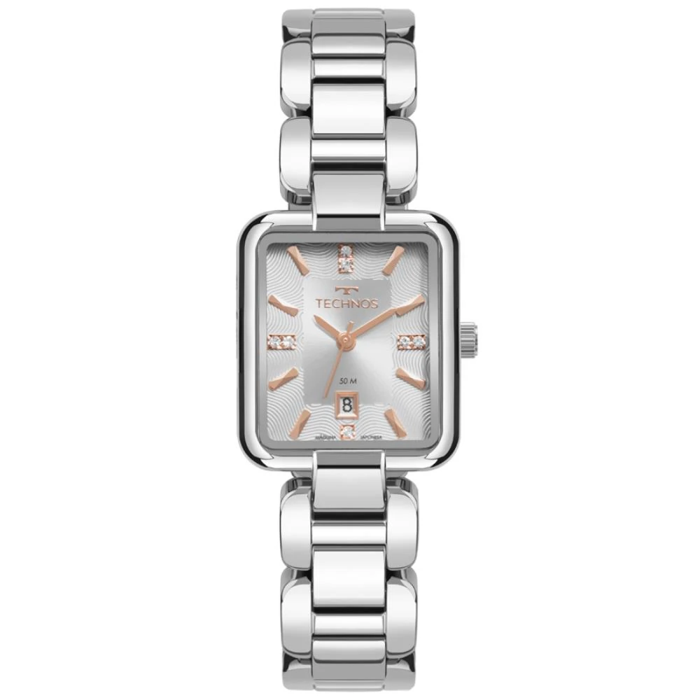 Caixa de Aço InoxPulseira de Aço Inox Estilo BaceleteFundo de PressãoResistente à Água 5 AtmDiâmetro / Largura da Caixa: 26.00 MM x 28.00 MMVidro de Cristal MineralFunções: Analógico, CalendárioMaquina JaponesaAlimentação do Maquinário: BateriaMostrador Prateado com pedrasGarantia de 1 Ano