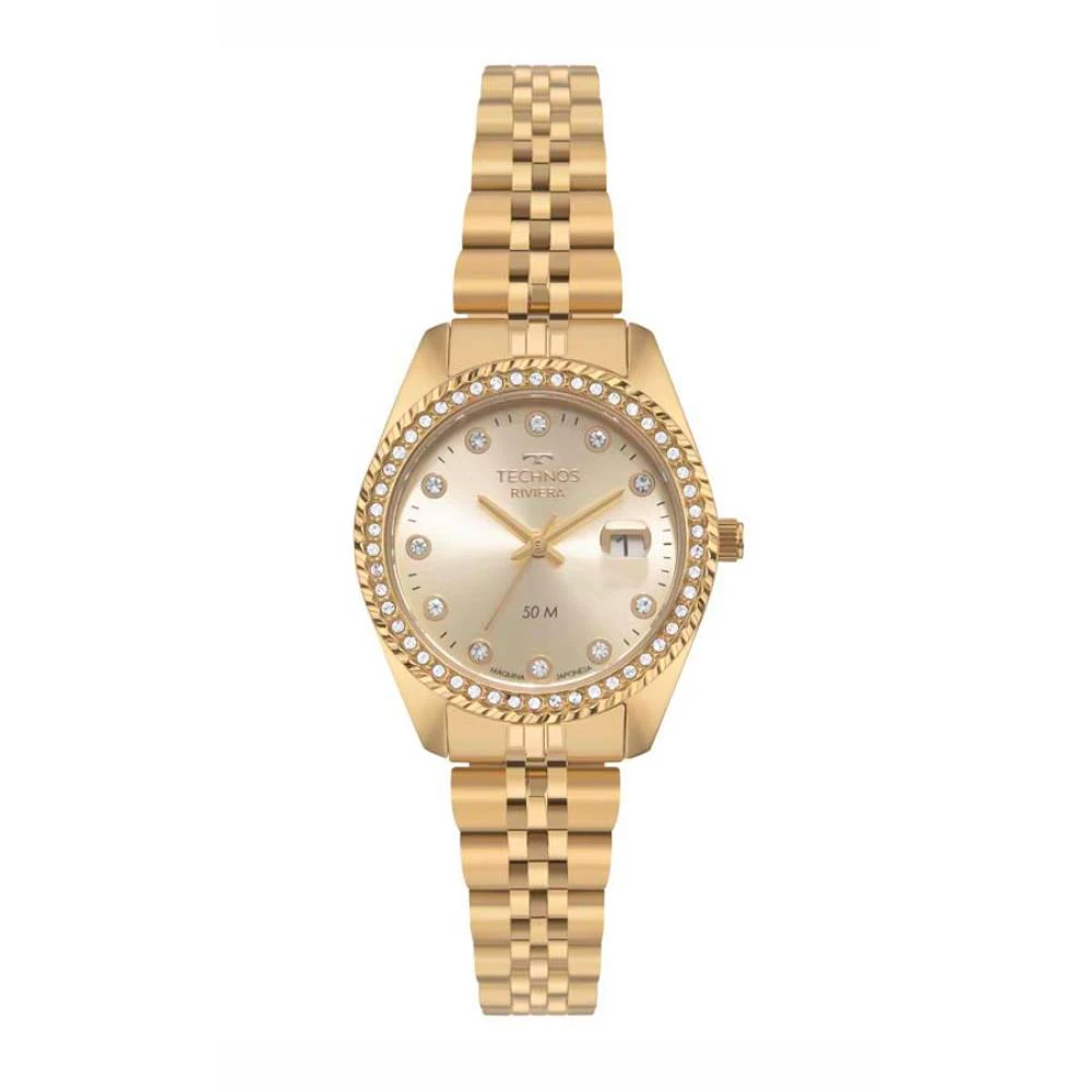 Caixa de Aço InoxPulseira de Aço InoxFundo de PressãoResistente à Água 5 AtmDiâmetro / Largura da Caixa: 29.00 MMVidro de Cristal MineralFunções: Analógico, Calendário com LupaMaquina JaponesaAlimentação do Maquinário: BateriaMostrador Dourado com pedrasAro externo de pedrasLinha: Technos RivieraGarantia de 1 Ano