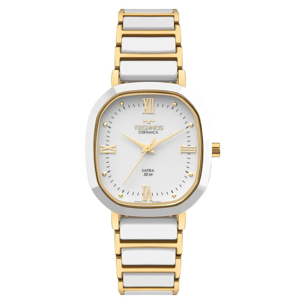 Caixa de Aço InoxPulseira de Aço Inox com detalhes em cerâmica brancaFundo de PressãoResistente à Água 5 AtmDiâmetro / Largura da Caixa: 30.00 MM x 32.00 MMVidro de SafiraFunções: AnalógicoMaquina JaponesaAlimentação do Maquinário: BateriaMostrador branco com algarismos romanosAro Externo Fixo de Cerâmica branca FacetadoGarantia de 1 Ano