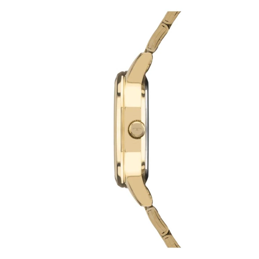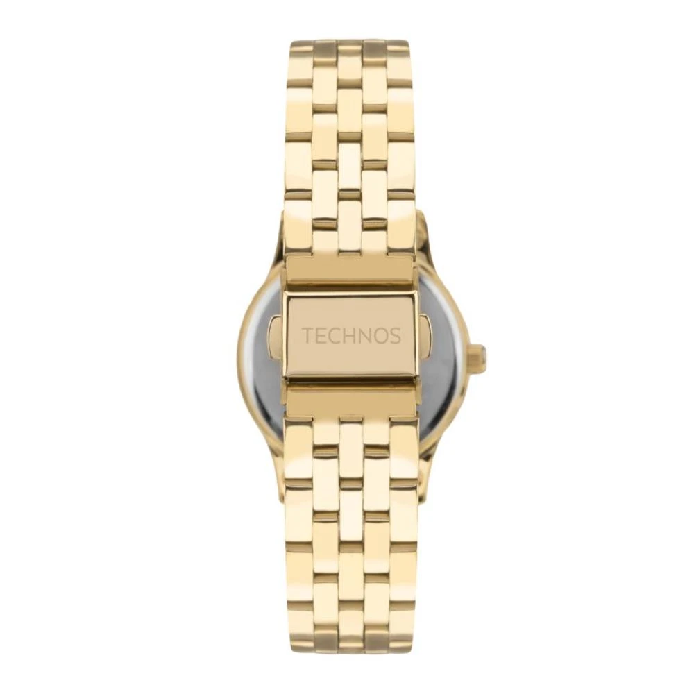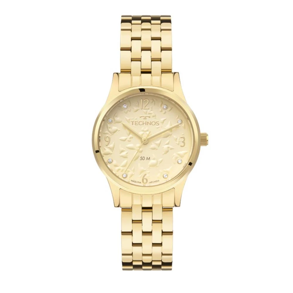 Caixa de Aço InoxPulseira de Aço InoxFundo de PressãoResistente à Água 5 AtmDiâmetro / Largura da Caixa: 32.00 MMVidro de Cristal MineralFunções: AnalógicoMaquina JaponesaAlimentação do Maquinário: BateriaMostrador Dourado com números, pedras e detalhes em alto relevoGarantia de 1 Ano
