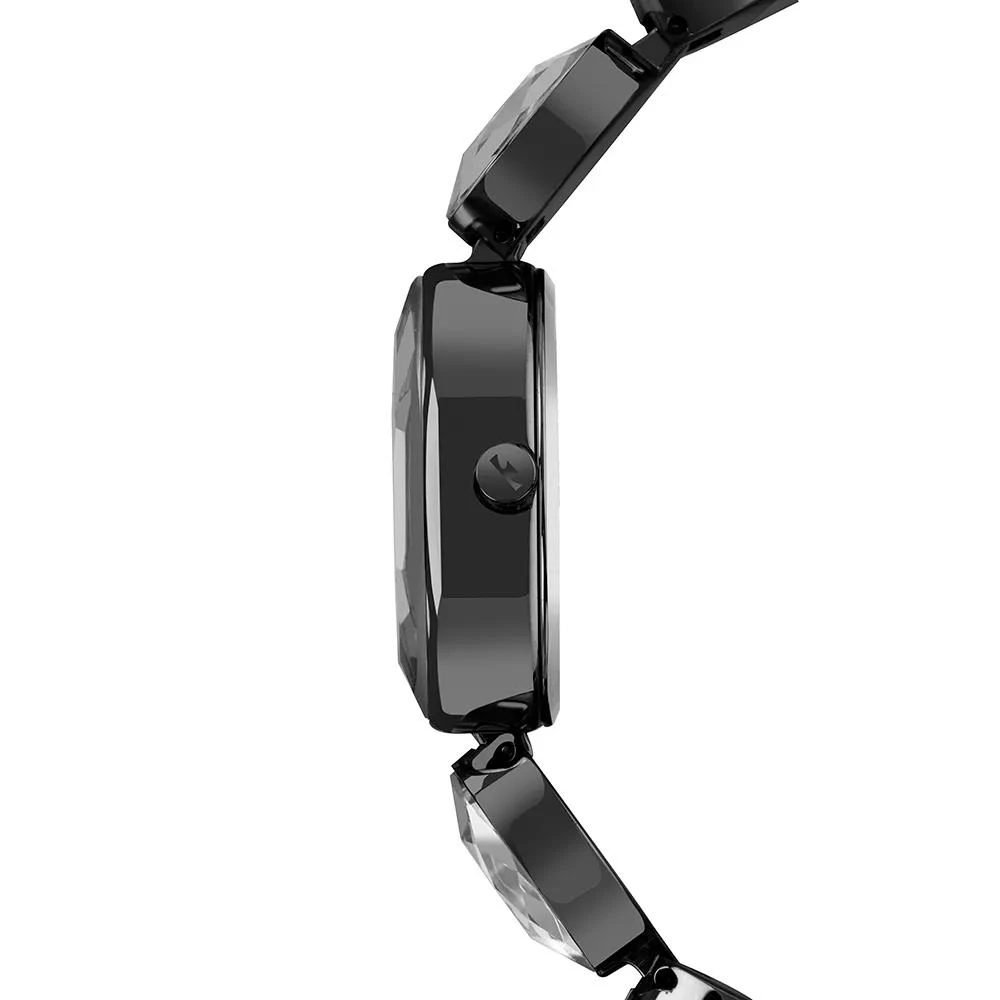 Caixa de Aço InoxPulseira de Aço Inox Estilo Bracelete com Pedras Fundo de PressãoResistente à Água 5 AtmDiâmetro / Largura da Caixa: 21.00 MM x 27.00 MMVidro de Cristal Mineral FacetadoFunções: AnalógicoMaquina JaponesaAlimentação do Maquinário: BateriaMostrador Preto com pedrasGarantia de 1 Ano