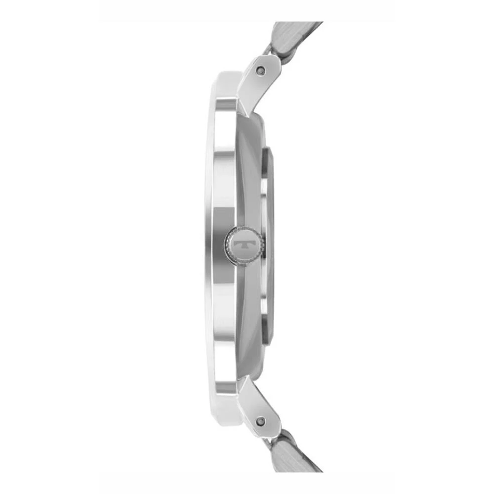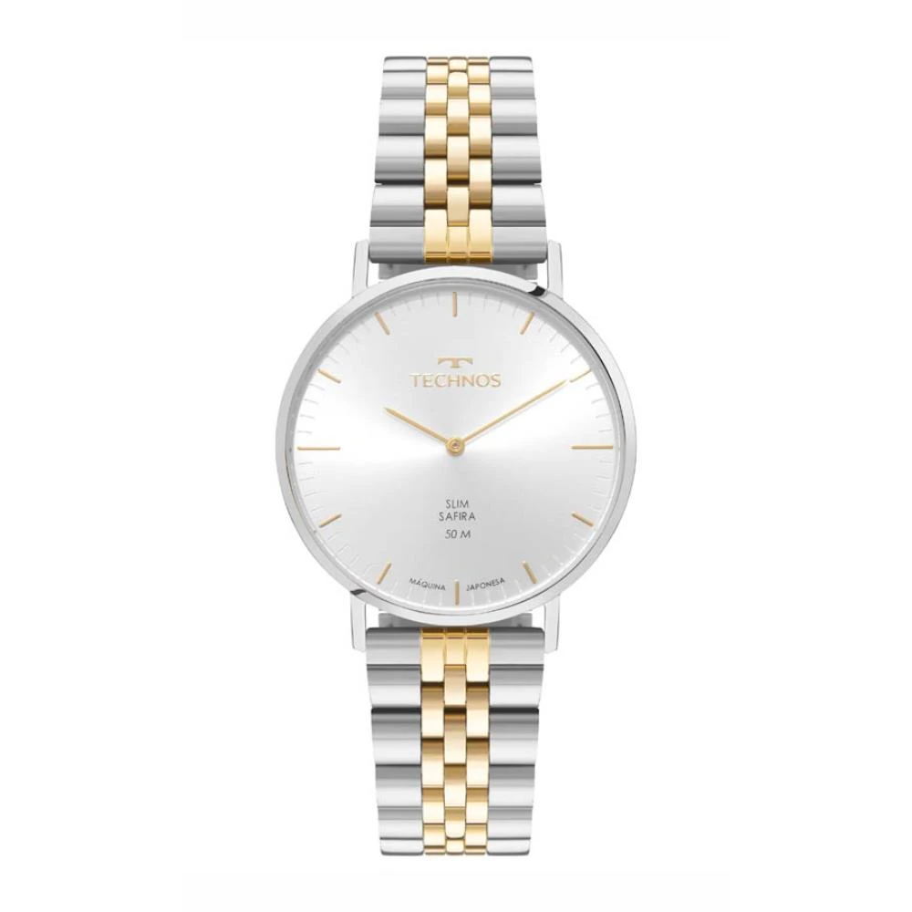Caixa de AçoPulseira de AçoFundo de PressãoResistente à Água 5 AtmDiâmetro / Largura da Caixa: 40.00 MMEspessura da Caixa: 8.00 MMVidro: SafiraFunções: Analógico, SlimAlimentação do Maquinário: BateriaMostrador Prateado com detalhes em DouradoMaquinário JaponêsPrateado com Dourado