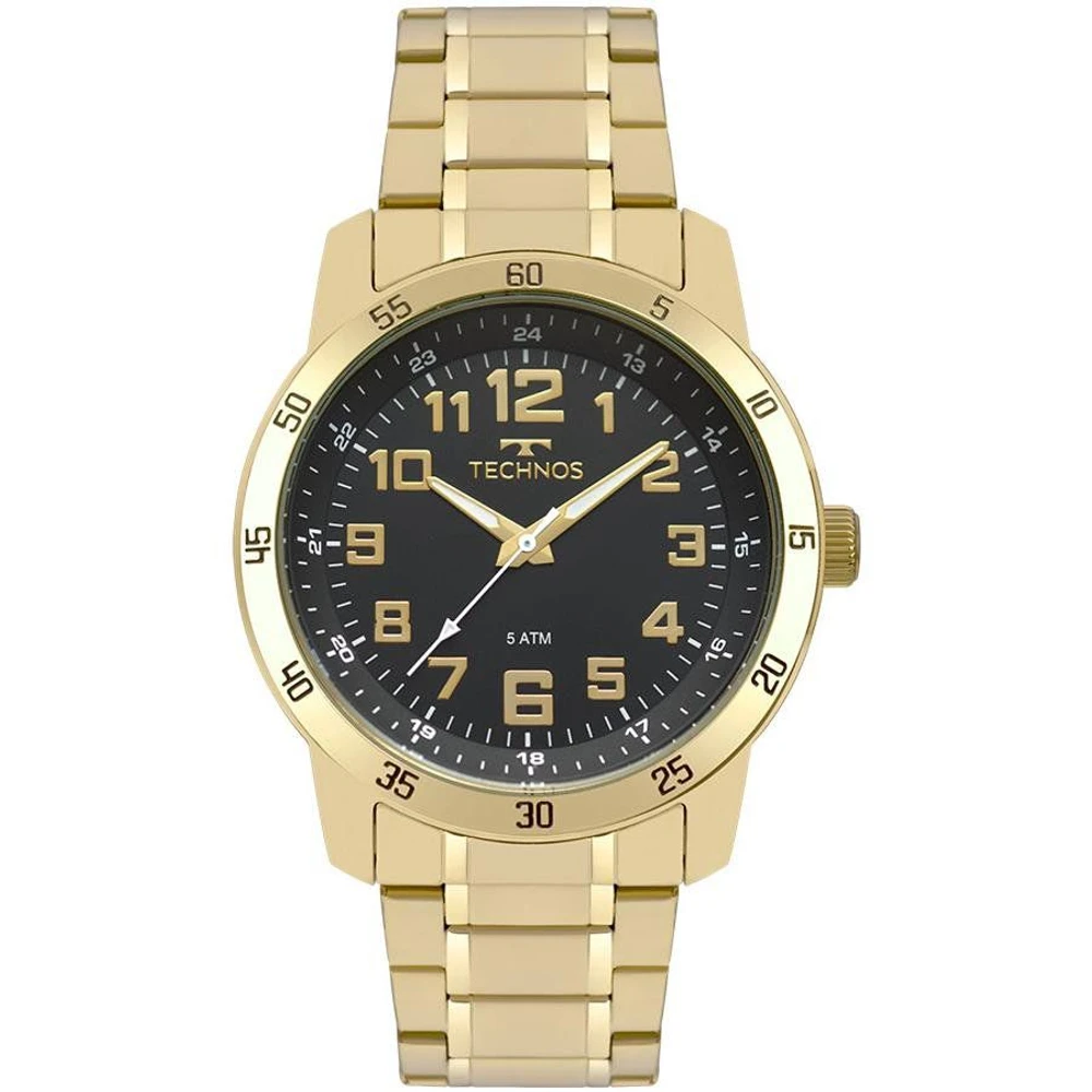 Relógio Technos Racer masculino dourado com pulseira e caixa de aço, mostrador preto com calendário e numeração em itálico dão o toque esportivo ao modelo.