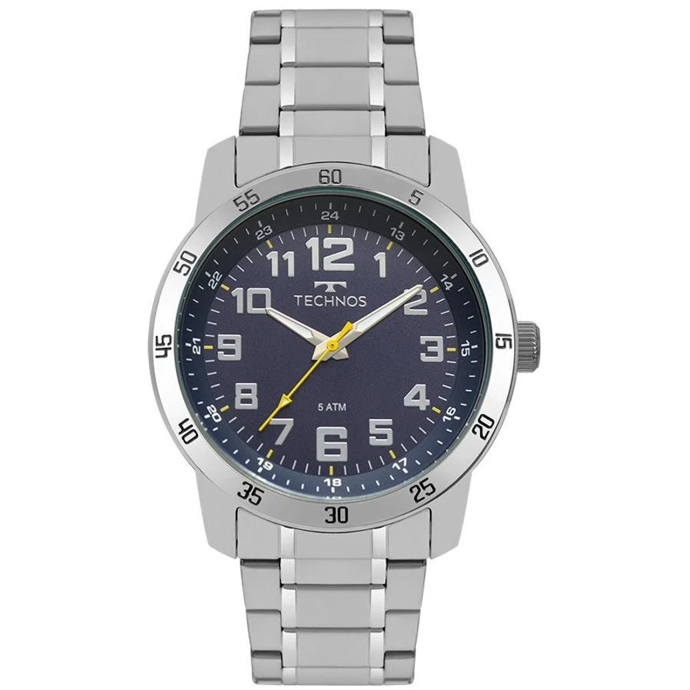 Relógio Technos Racer masculino prateado com pulseira e caixa de aço, mostrador preto com calendário e numeração em itálico dão o toque esportivo ao modelo.