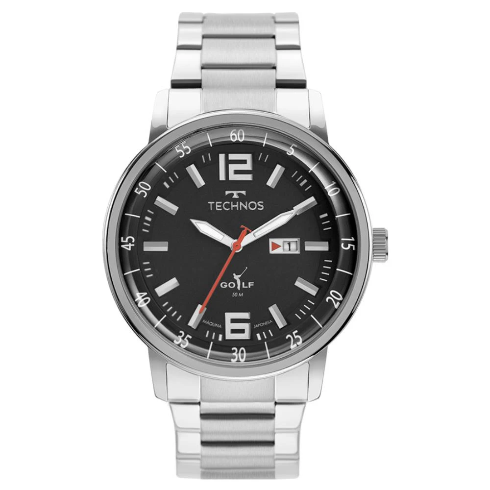 Caixa de Aço InoxidávelPulseira de Aço InoxidávelFundo de RoscaResistente à Água 5 AtmDiâmetro / Largura da Caixa: 46.00 MMFunções: Analógico, CalendárioAlimentação do Maquinário: BateriaMostrador Preto com NúmerosLinha: Technos GolfMaquinário Japonês