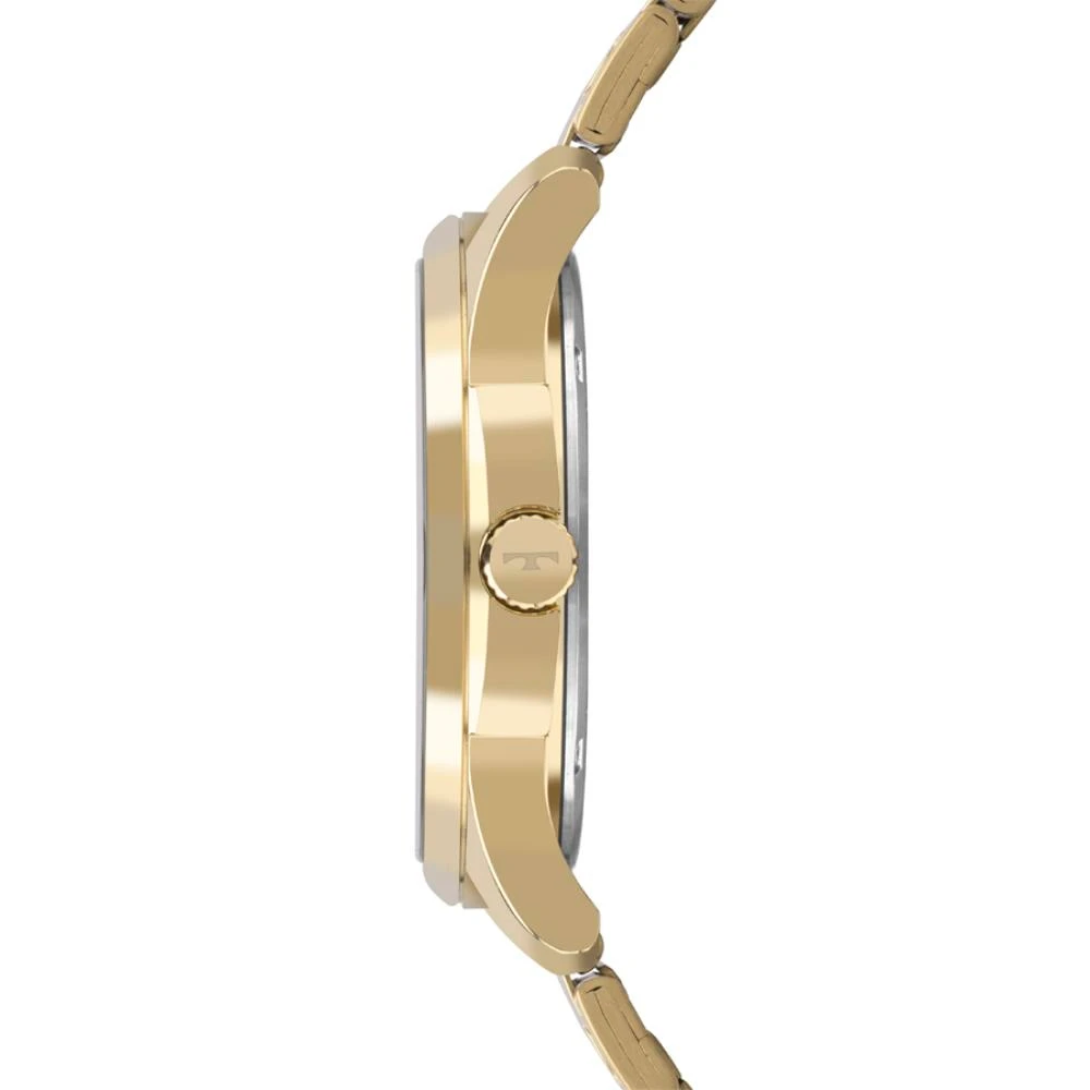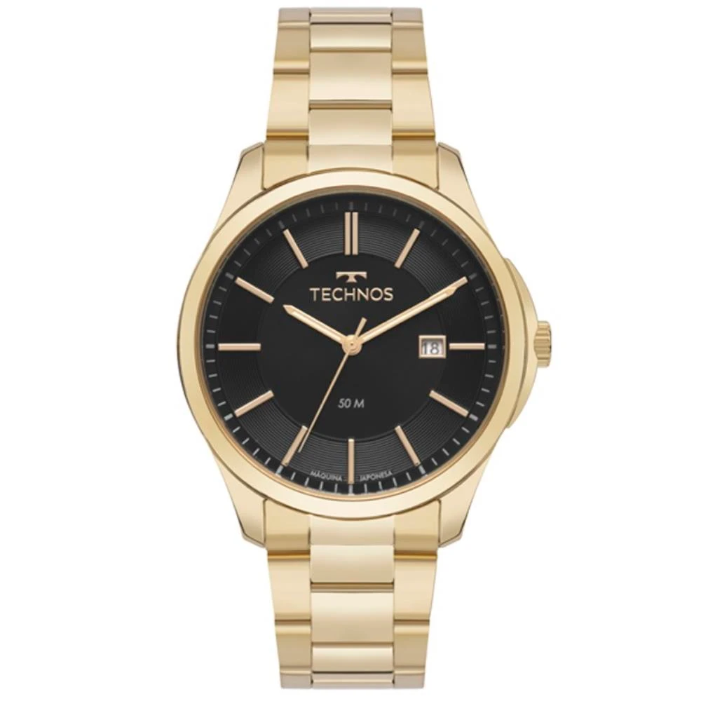 Caixa de AçoPulseira de AçoFundo RosqueadoResistente à Água 5 AtmDiâmetro / Largura da Caixa: 40.00 MMFunções: Analógico, CalendárioAlimentação do Maquinário: BateriaMostrador Preto com detalhes em douradoMaquinário Japonês