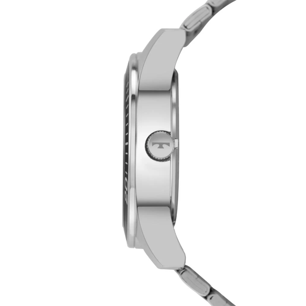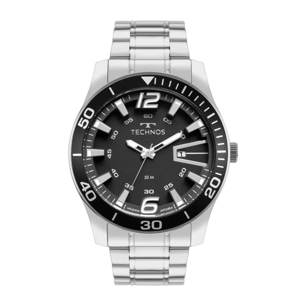 Caixa de AçoPulseira de AçoFundo RosqueadoResistente à Água 5 AtmDiâmetro / Largura da Caixa: 46.00 MMFunções: Analógico, CalendárioAlimentação do Maquinário: BateriaMostrador Preto com NúmerosAro fixo preto com númerosMaquinário Japonês