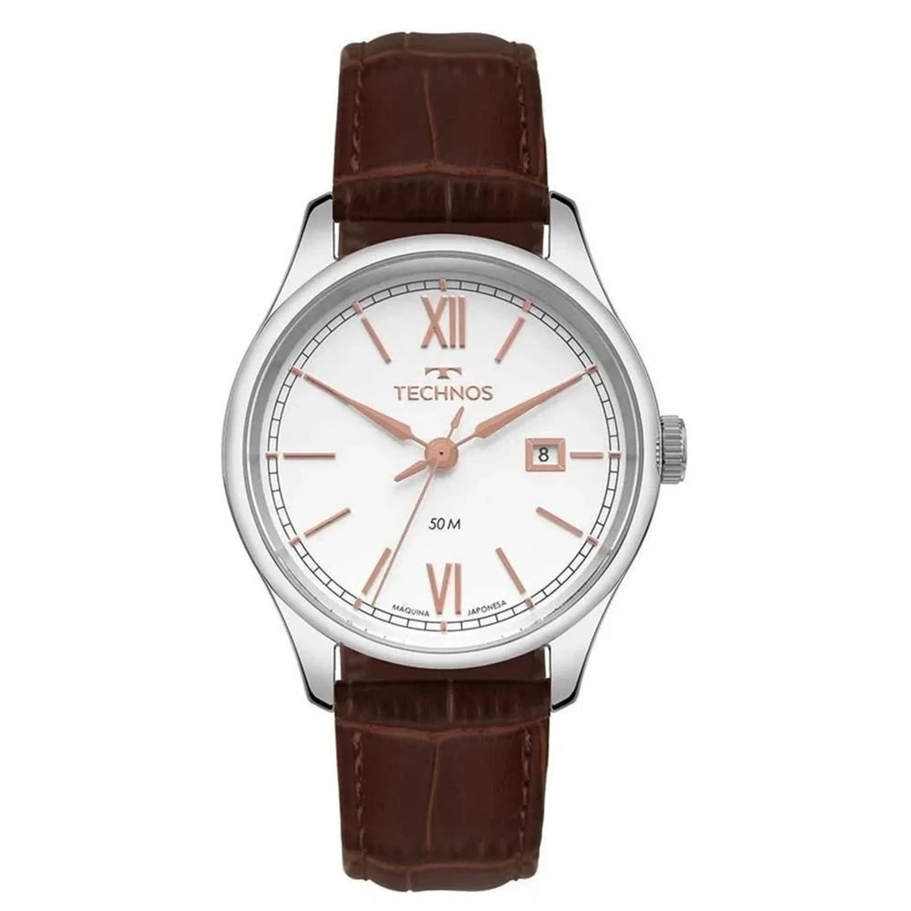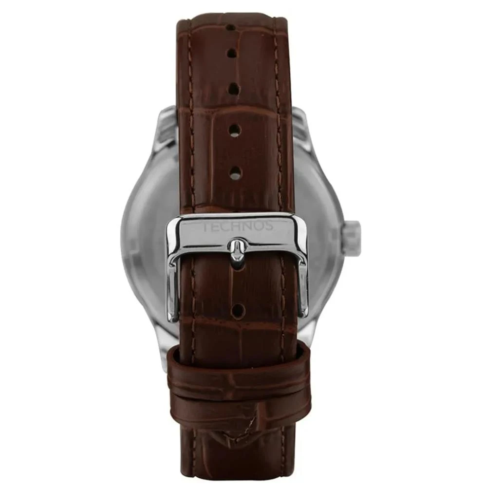 Caixa de AçoPulseira de Couro Legítimo MarromFundo RosqueadoResistente à Água 5 AtmDiâmetro / Largura da Caixa: 40.00 MMFunções: Analógico, CalendárioAlimentação do Maquinário: BateriaMostrador Prateado com algarismos romanosMaquinário Japonês
