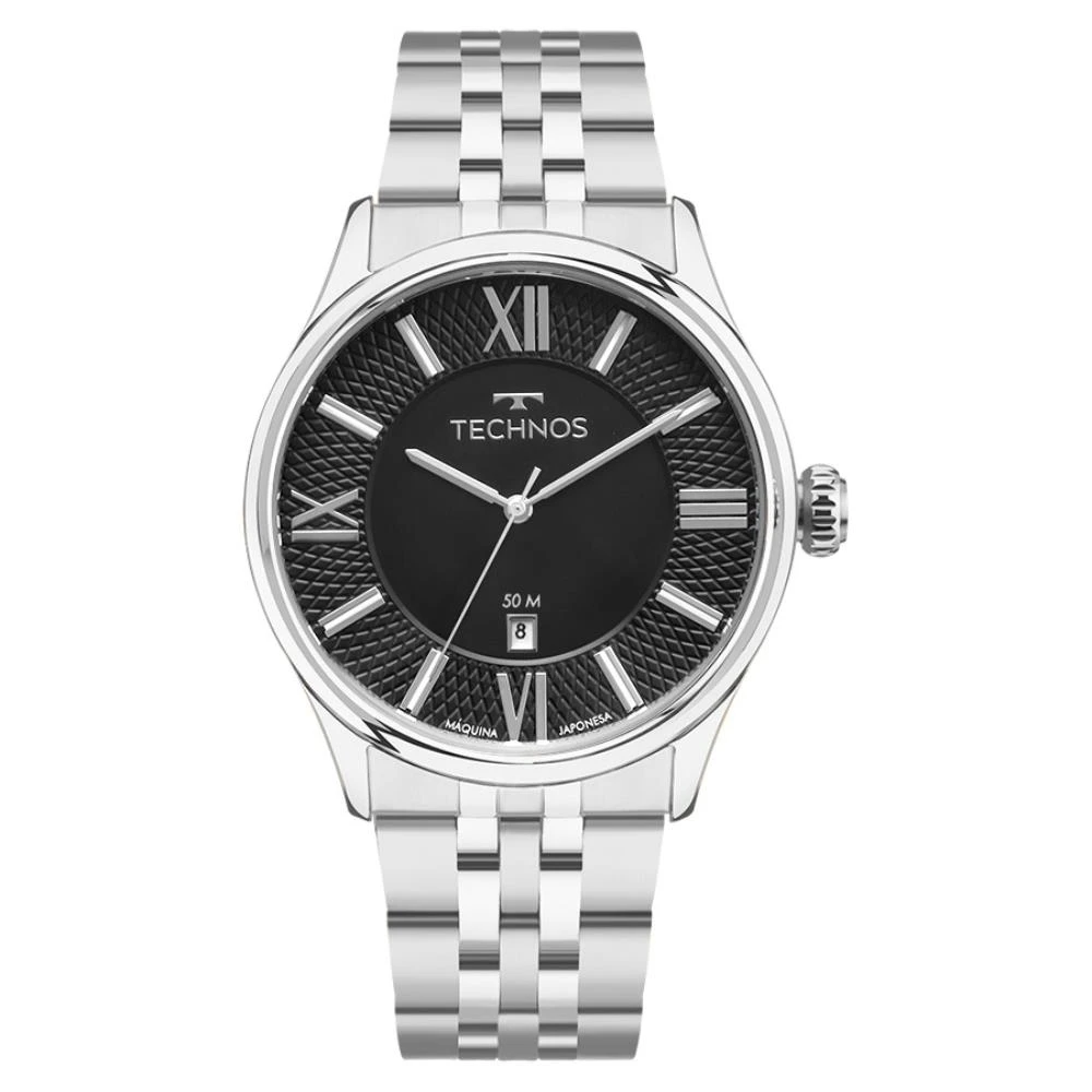Caixa de AçoPulseira de AçoFundo RosqueadoResistente à Água 5 AtmDiâmetro / Largura da Caixa: 44.00 MMFunções: Analógico, CalendárioAlimentação do Maquinário: BateriaMostrador Preto com algarismos romanosMaquinário Japonês