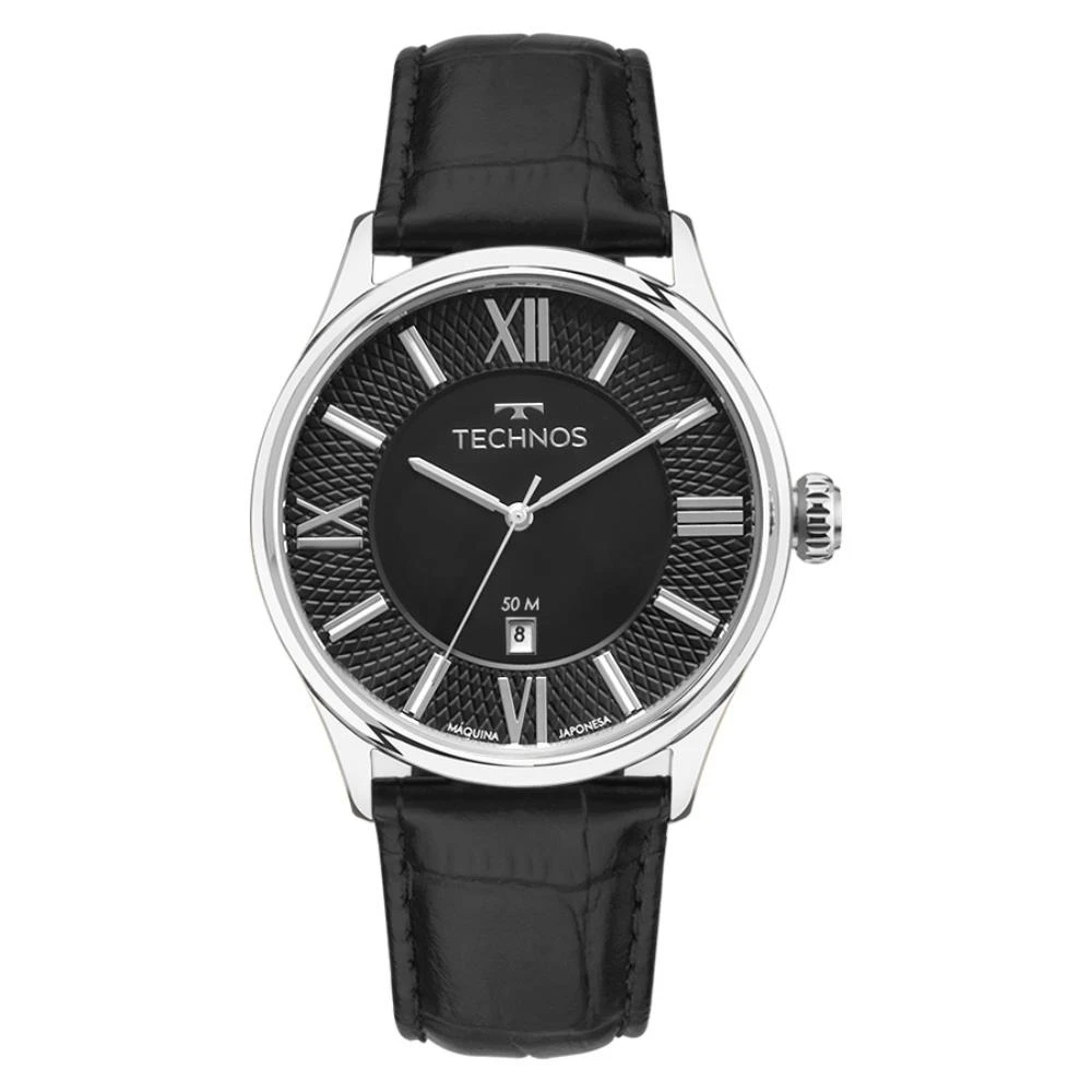 Caixa de AçoPulseira de Couro Legítimo PretaFundo RosqueadoResistente à Água 5 AtmDiâmetro / Largura da Caixa: 44.00 MMFunções: Analógico, CalendárioAlimentação do Maquinário: BateriaMostrador Preto com algarismos romanosMaquinário Japonês
