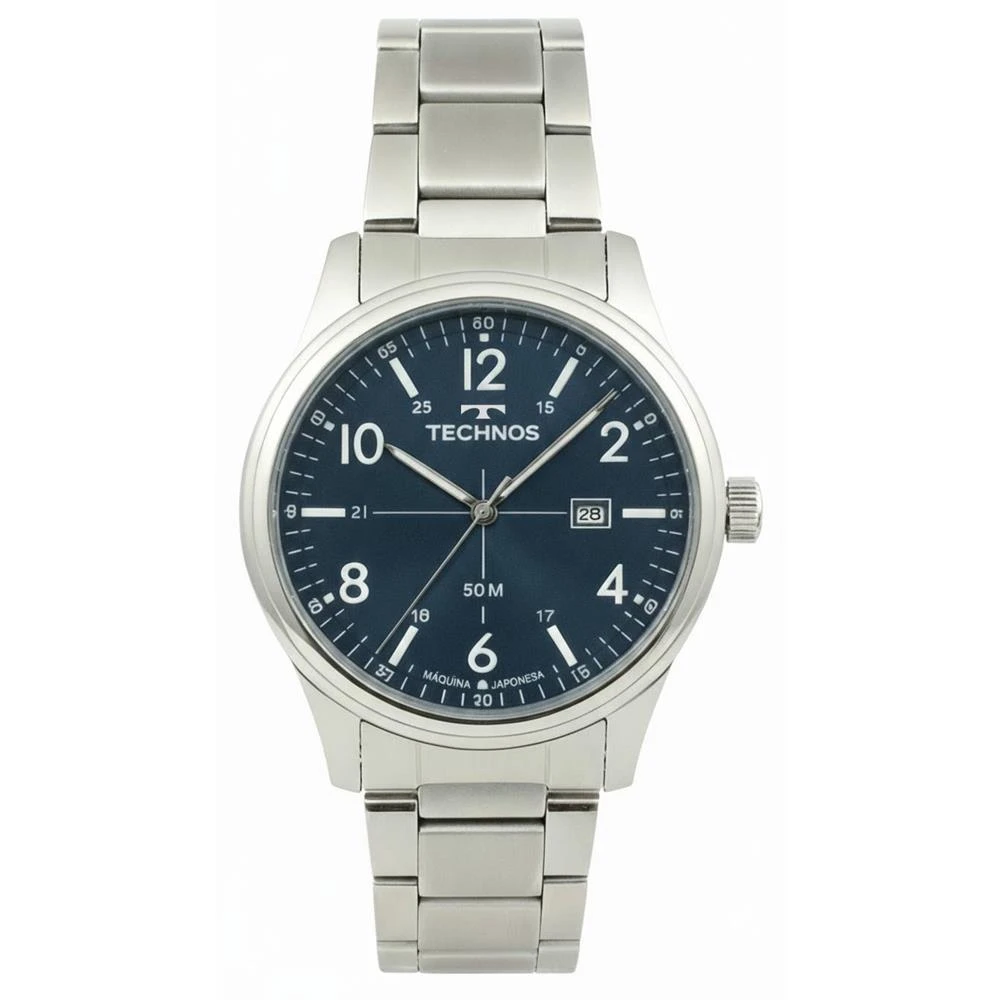 Caixa de AçoPulseira de AçoFundo de PressãoResistente à Água 5 AtmDiâmetro / Largura da Caixa: 42.00 MMFunções: Analógico, CalendárioAlimentação do Maquinário: BateriaMostrador Azul com NúmerosMaquinário Japonês