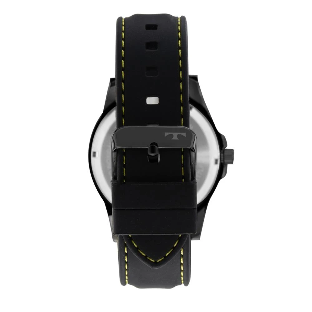 Caixa de AçoPulseira de Silicone Preto com costura em amareloFundo RosqueadoResistente à Água 5 AtmDiâmetro / Largura da Caixa: 45.00 MMFunções: Analógico, CalendárioAlimentação do Maquinário: BateriaMostrador Preto com detalhes em amareloMaquinário Japonês