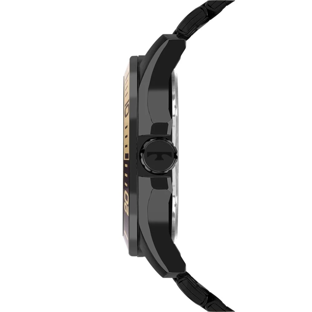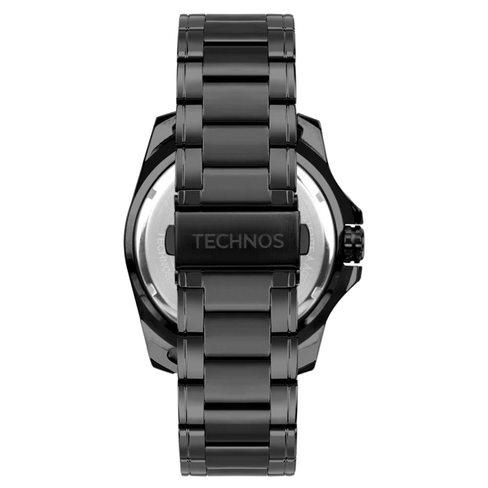 Caixa de AçoPulseira de AçoFundo de RoscaResistente à Água 5 AtmDiâmetro / Largura da Caixa: 46.00 MMFunções: Analógico, CalendárioAlimentação do Maquinário: BateriaMostrador Preto com NúmerosAro Fixo Preto com detalhes em DouradoMaquinário Japonês