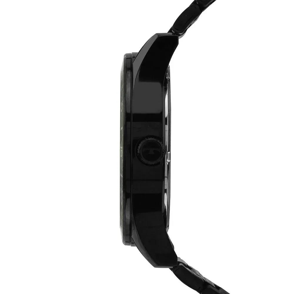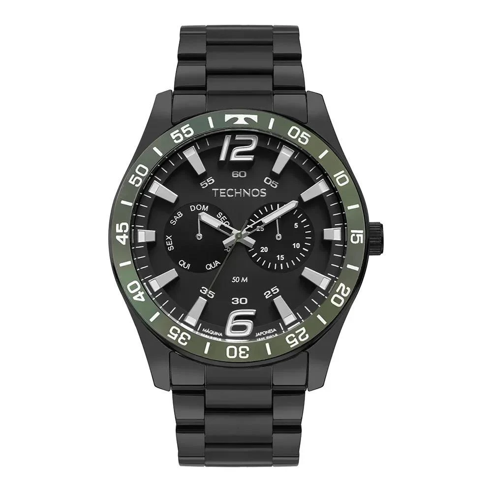 Caixa de AçoPulseira de AçoFundo de RoscaResistente à Água 5 AtmDiâmetro / Largura da Caixa: 45.00 MMFunções: Analógico, Multifunção (Calendário Semanal e Mensal)Alimentação do Maquinário: BateriaMostrador Preto com númerosMáquina JaponesaAro Fixo verde
