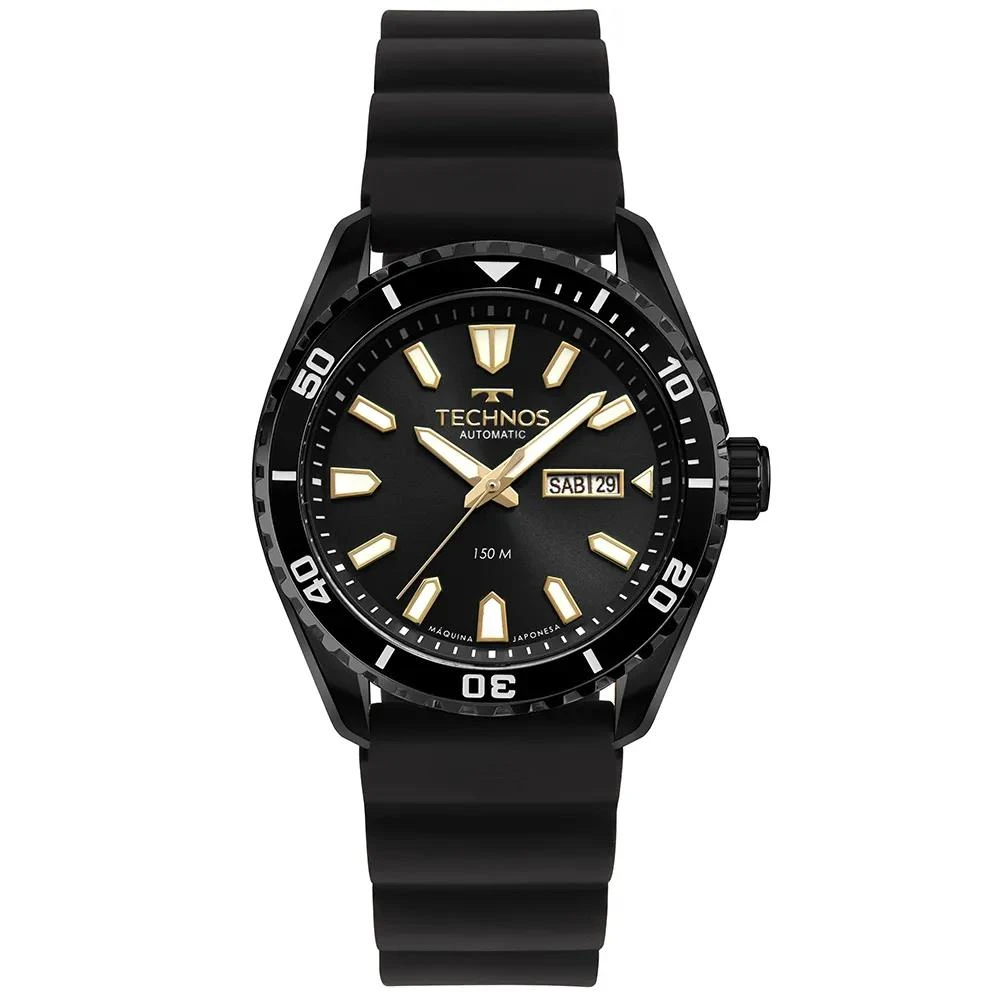 Caixa de AçoPulseira de Silicone PretaVidr: Cristal MineralFundo Rosqueado com detalhe de vidro que permite a visualização do maquinárioResistente à Água 15 AtmDiâmetro / Largura da Caixa: 42.00 MMFunções: Analógico, Automático, Calendário Duplo (Com opção do calendário semanal em inglês ou espanhol)Alimentação do Maquinário: Automático, CordaMostrador Preto com detalhes em douradoAro giratório PretoMovimento JaponêsGarantia de 1 Ano