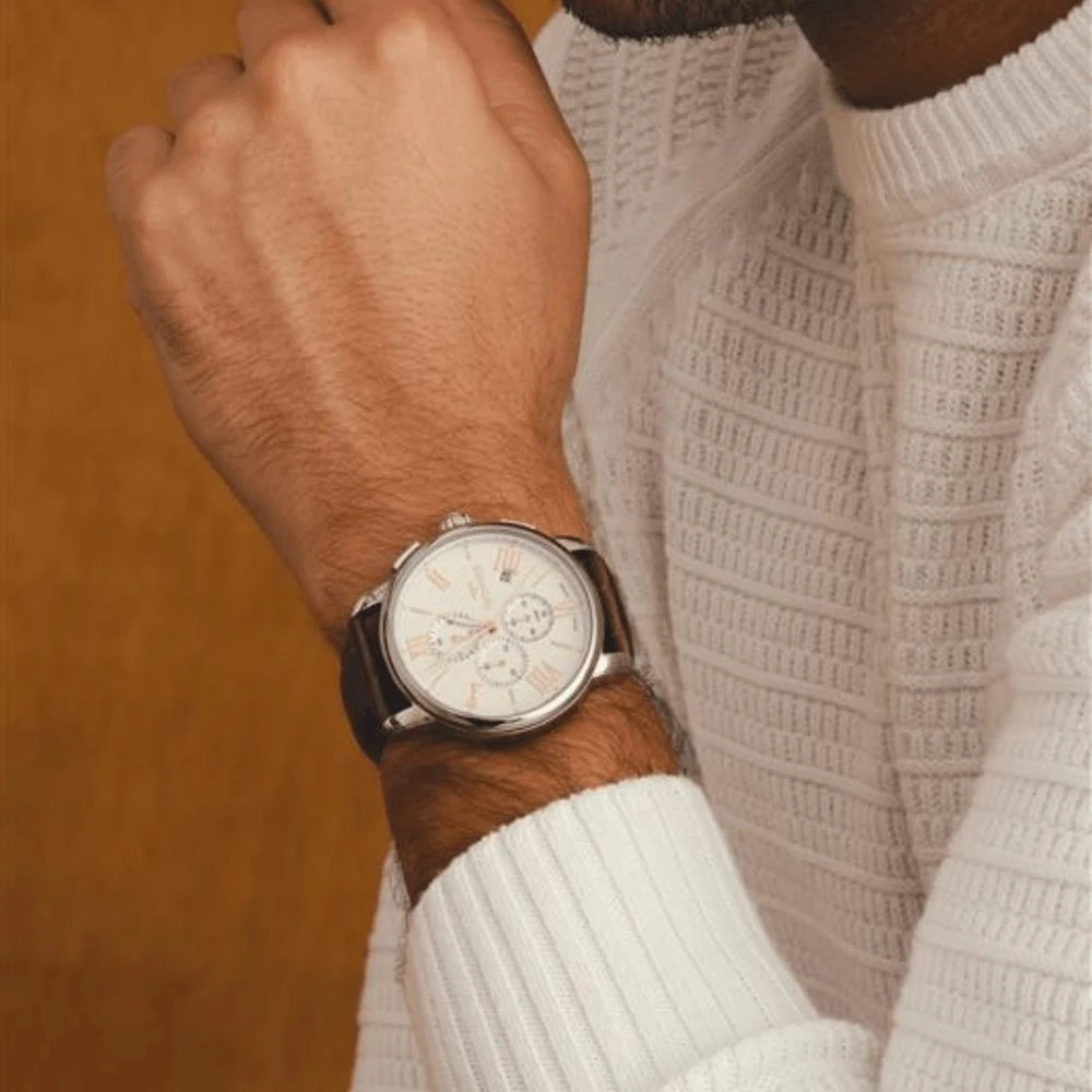 Caixa de AçoPulseira de Couro Legítima MarromFundo RosqueadoResistente à Água 10 AtmVidro: Cristal MineralDiâmetro / Largura da Caixa: 44.00 MMFunções: Analógico, Cronógrafo, CalendárioAlimentação do maquinário: BateriaMostrador Prateado com algarismos romanos e detalhes em RoséLinha: Technos GrandtechGarantia de 1 Ano