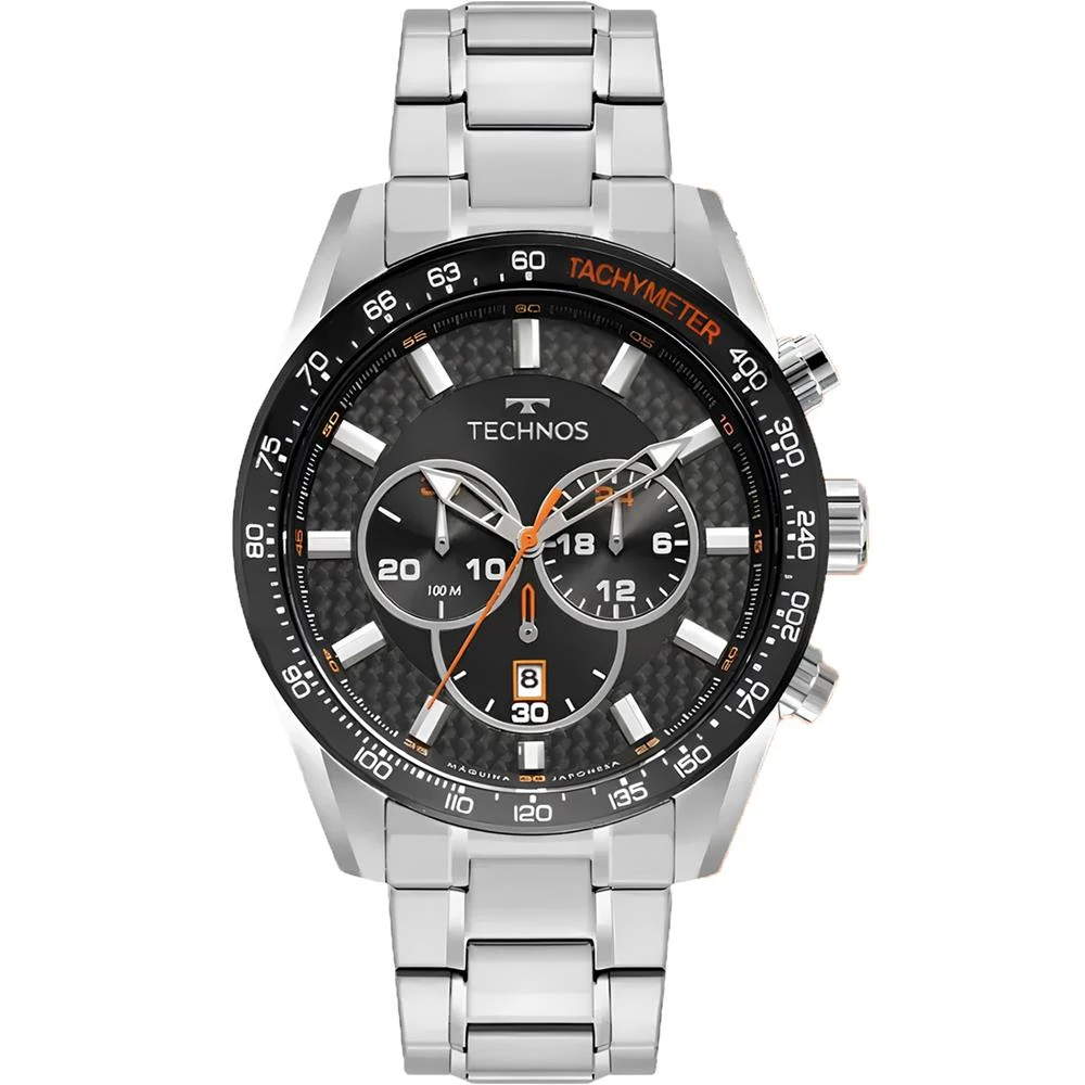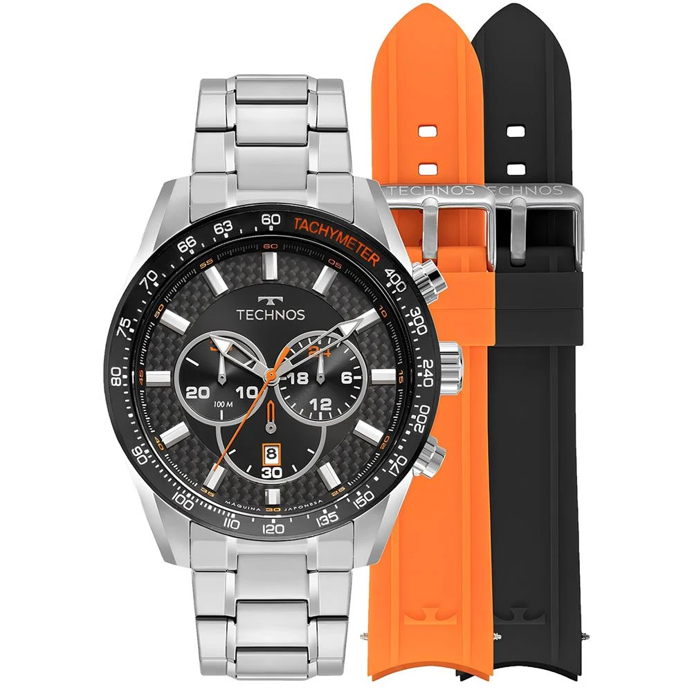 Caixa de AçoPulseira de AçoFundo RosqueadoResistente à Água 10 AtmVidro: Cristal MineralDiâmetro / Largura da Caixa: 49.00 MMFunções: Analógico, Cronógrafo, CalendárioAlimentação do maquinário: BateriaMostrador Preto com detalhes em LaranjaLinha: Technos Sport CarbonAro Fixo Preto com Taquímetro+ 2 Pulseiras Extra de Silicone (Preta e Laranja)Garantia de 1 Ano