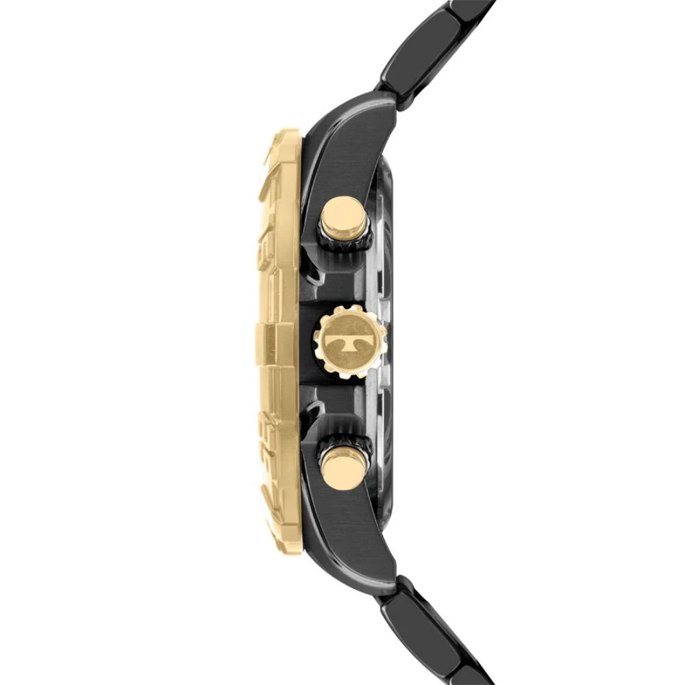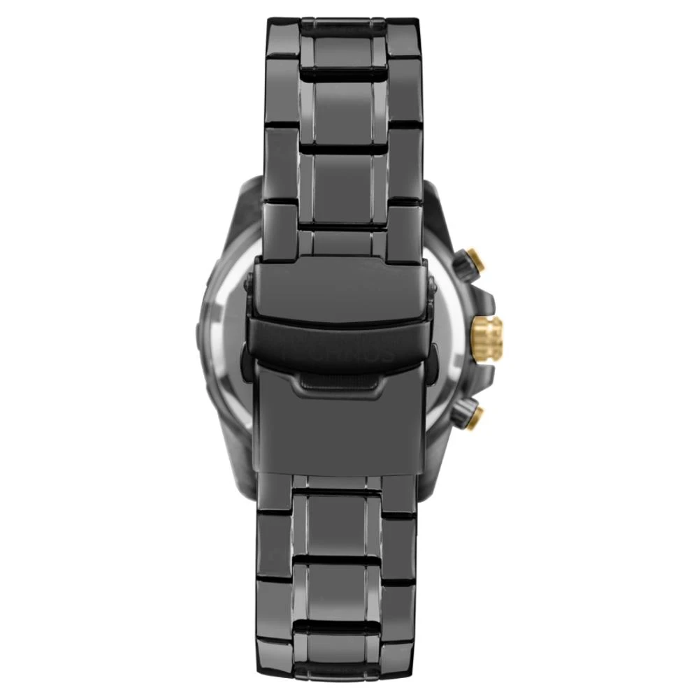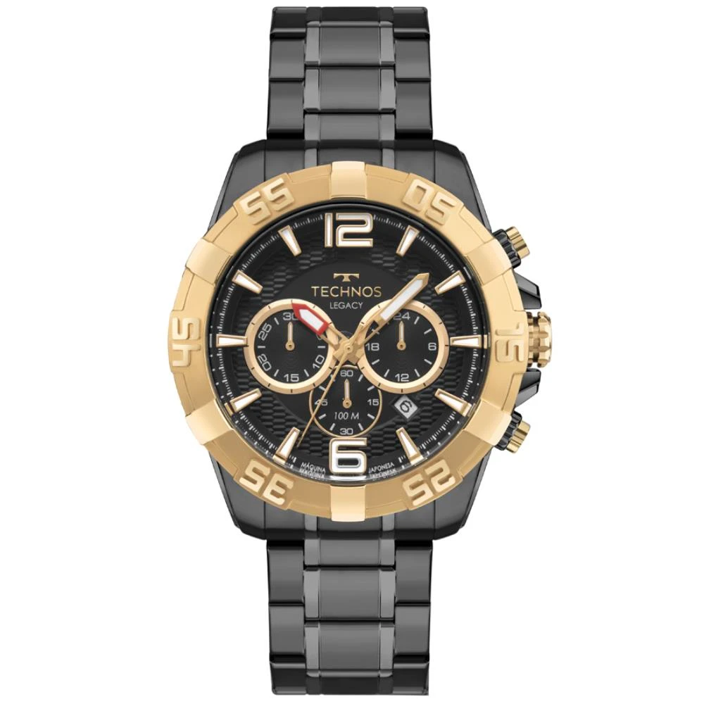 Caixa de AçoPulseira de AçoFundo RosqueadoResistente à Água 10 AtmVidro: Cristal MineralDiâmetro / Largura da Caixa: 45.00 MMFunções: Analógico, Cronógrafo, CalendárioAlimentação do maquinário: BateriaMostrador Preto com números e detalhes em douradoAro Fixo DouradoLinha: Technos LegacyGarantia de 1 Ano