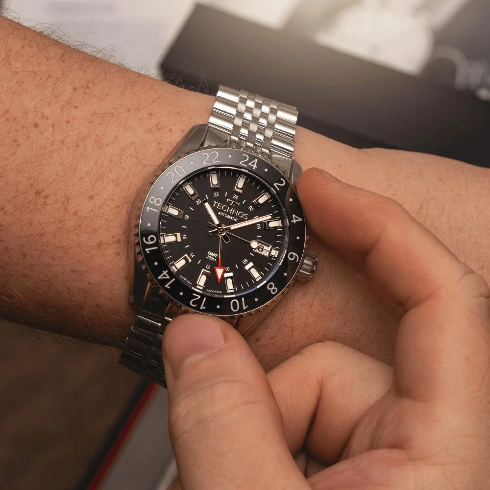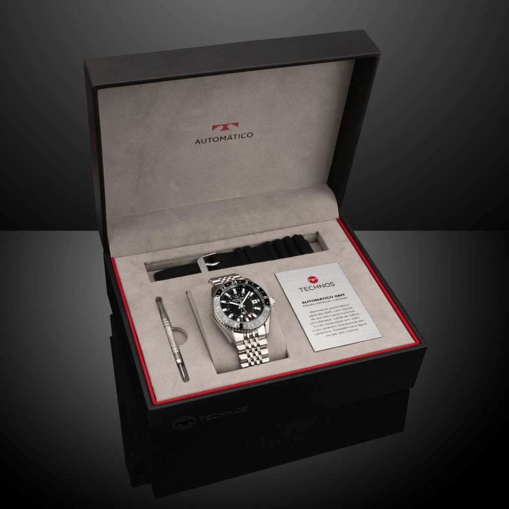 Caixa de AçoPulseira de AçoVidr: SafiraFundo Rosqueado com detalhe de vidro que permite a visualização do maquinárioResistente à Água 20 AtmDiâmetro / Largura da Caixa: 42.00 MMFunções: Analógico, Automático, Calendário, GMT (Fusos Horários)Alimentação do Maquinário: Automático, CordaMostrador PretoAro giratório Prateado com decalque pretoMovimento Japonês+ 1 Pulseira Extra de Silicone Preto e Chave para facilitar a troca de pulseirasGarantia de 1 Ano