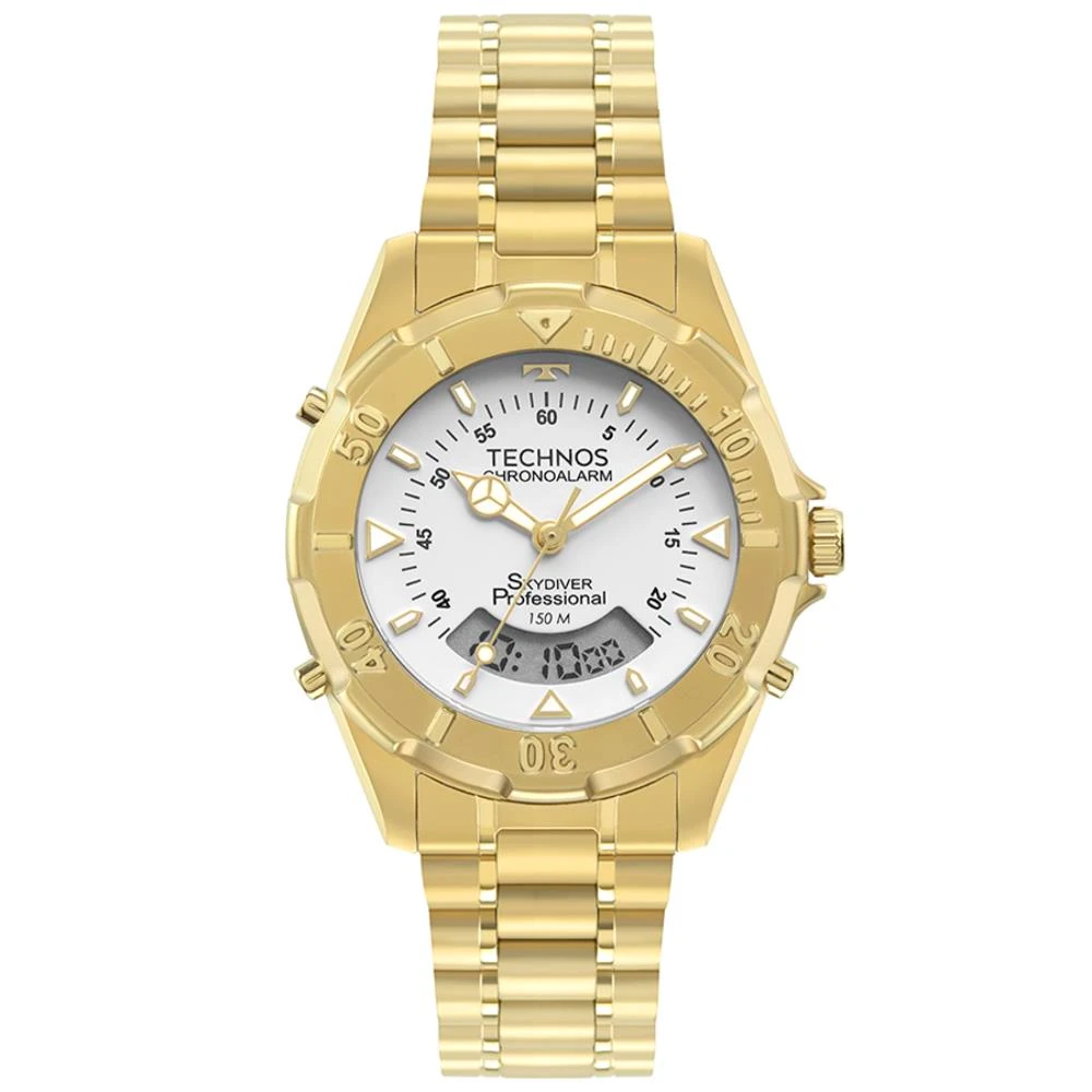 Caixa de Aço InoxPulseira de Aço InoxVidro: Cristal MineralFundo RosqueadoResistente à Água 15 AtmDiâmetro / Largura da Caixa: 40.00 MMFunções: Calendário, Cronógrafo, Alarme, AnadigiLinha: Technos SkydiverMostrador BrancoAro Giratório douradoAlimentação do Maquinário: BateriaGarantia de 1 Ano