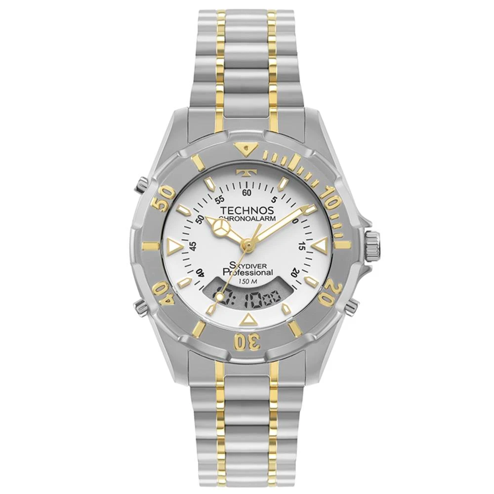 Caixa de Aço InoxPulseira de Aço InoxVidro: Cristal MineralFundo RosqueadoResistente à Água 15 AtmDiâmetro / Largura da Caixa: 40.00 MMFunções: Calendário, Cronógrafo, Alarme, AnadigiLinha: Technos SkydiverMostrador BrancoAro Giratório Prateado com detalhes em douradoAlimentação do Maquinário: BateriaPrateado com DouradoGarantia de 1 Ano