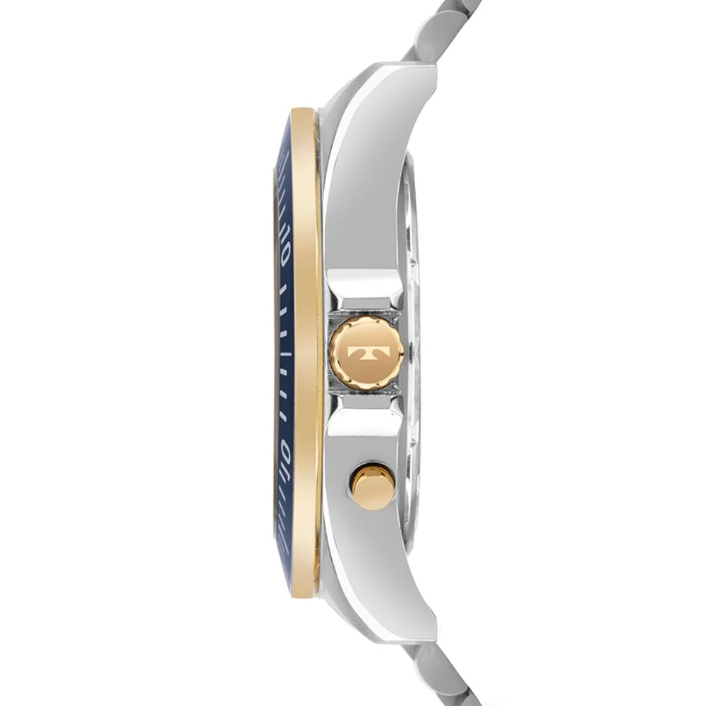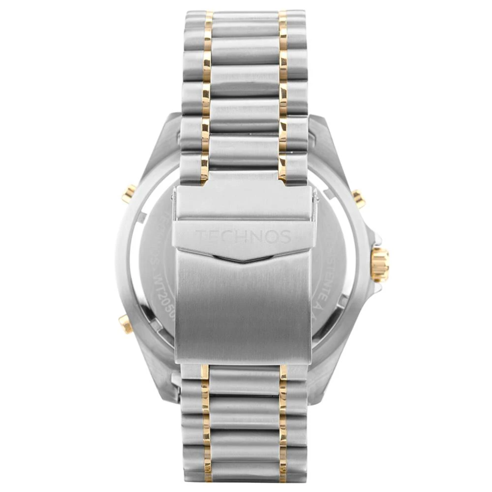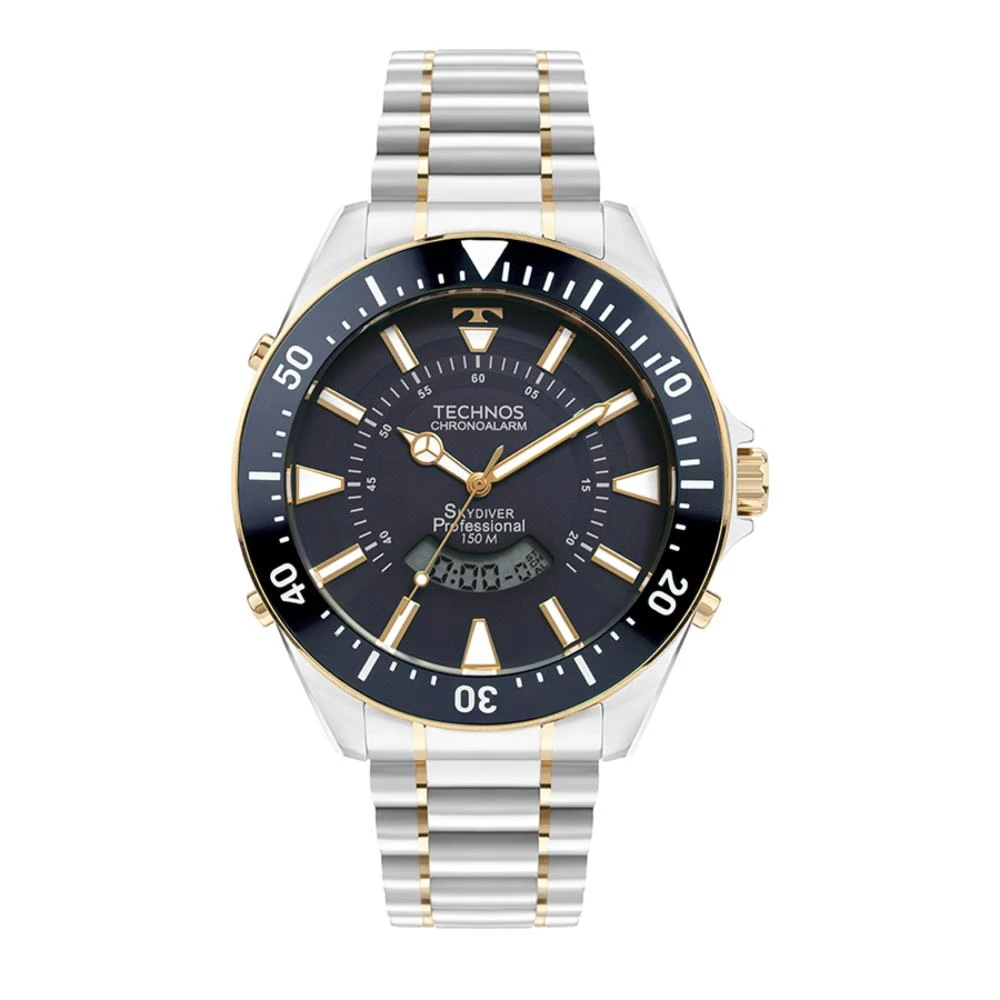 Caixa de Aço InoxPulseira de Aço InoxVidro: Cristal MineralFundo RosqueadoResistente à Água 15 AtmDiâmetro / Largura da Caixa: 50.00 MMFunções: Calendário, Cronógrafo, Alarme, AnadigiLinha: Technos SkydiverMostrador AzulAro Giratório AzulAlimentação do Maquinário: BateriaPrateado com DouradoGarantia de 1 Ano