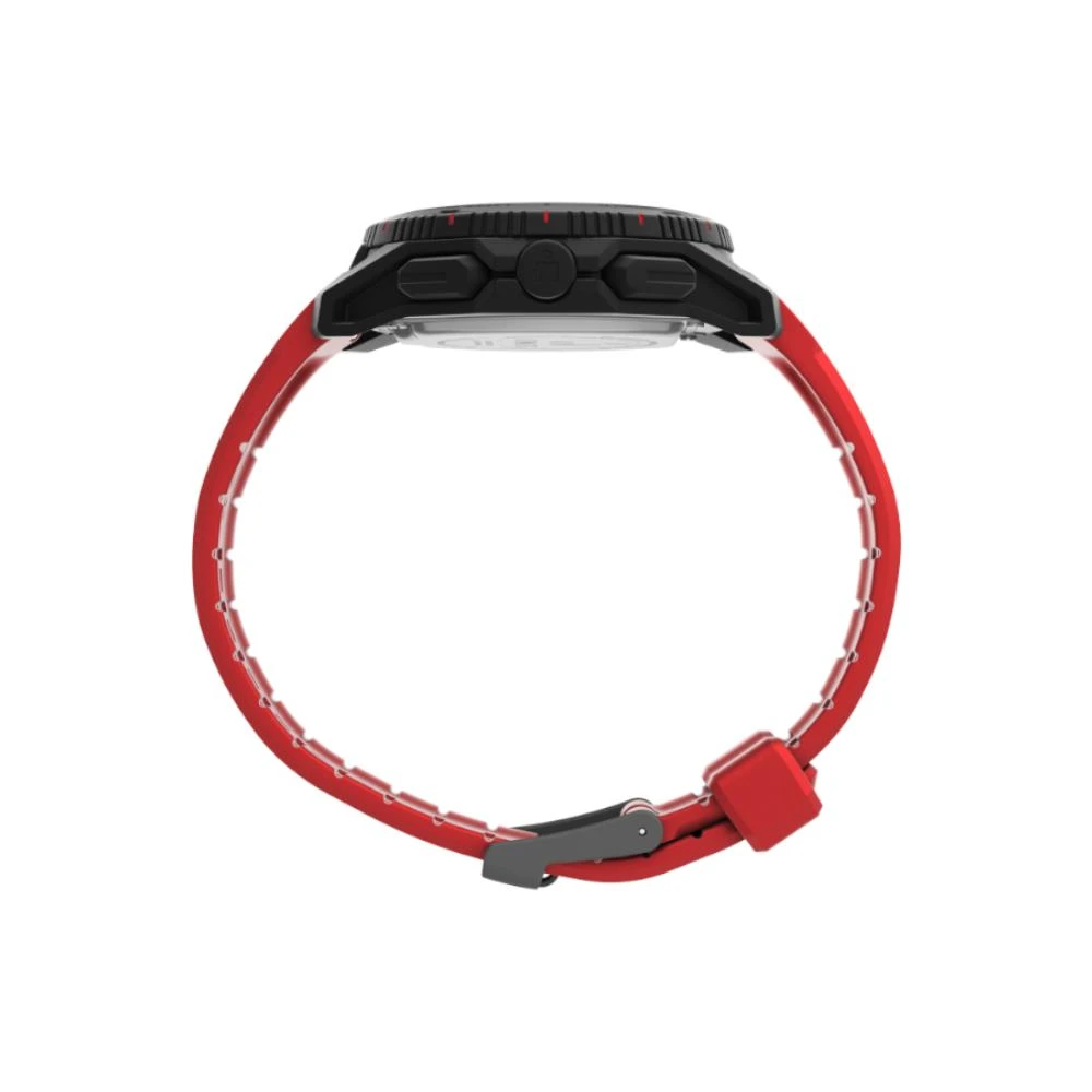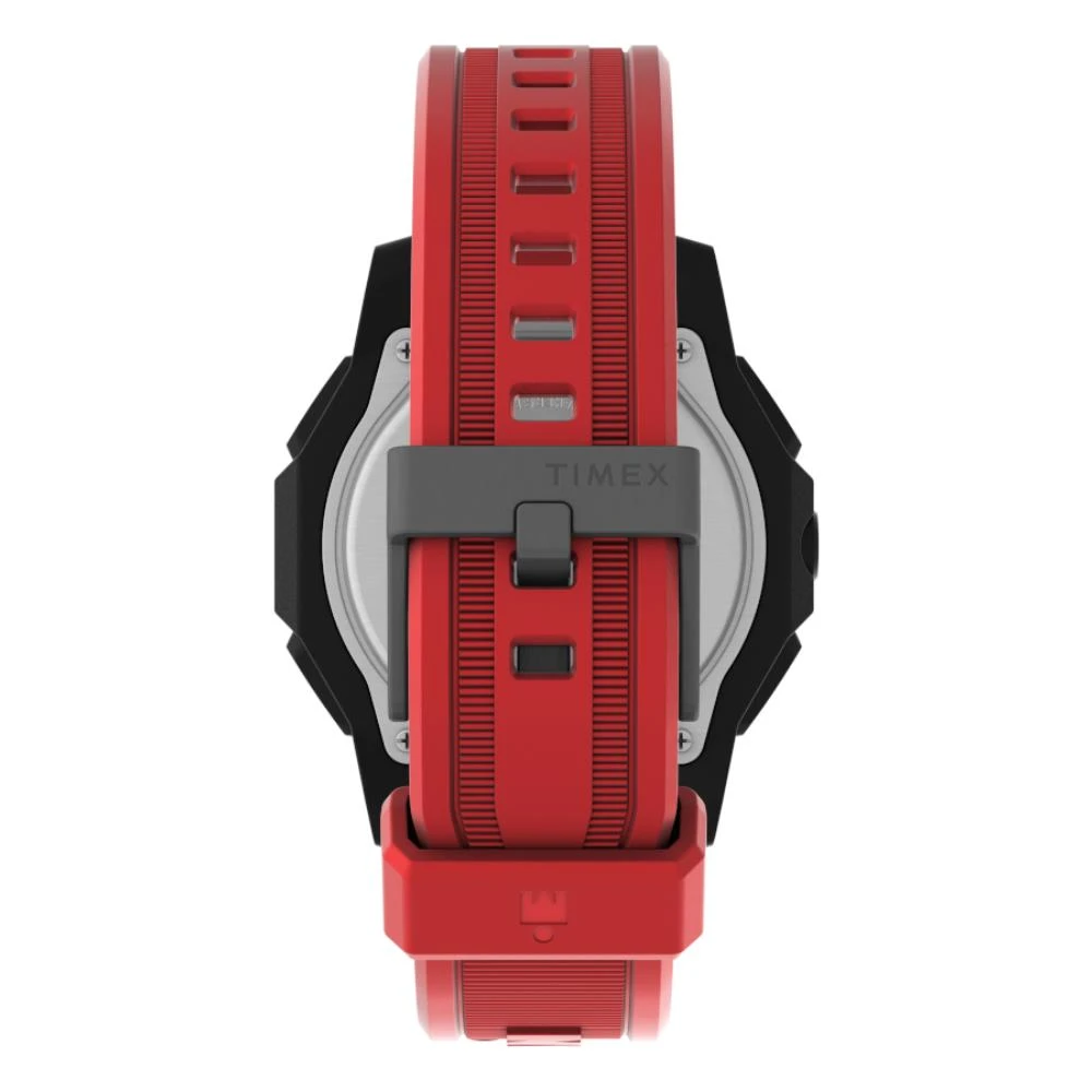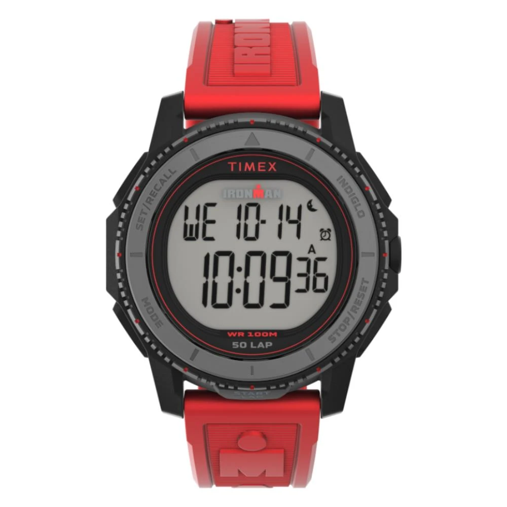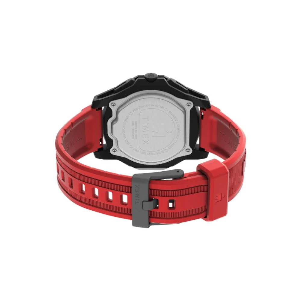 Funções: Digital, Iluminação (Indiglo Night Light), Calendário, Dual Time, Cronógrafo com memória para 50 voltas, Alarme, Timer, Sinal Horário OpcionalResistência à Água: 100mDiâmetro da Caixa: 47 mmCaracterísticas: com caixa em Resina Preta e pulseira em Poliuretano VermelhaVidro: AcrílicoFundo ParafusadoAlimentação do maquinário: BateriaMostrador Preto com detalhes em vermelhoLinha: Timex IronmanGarantia de 1 Ano