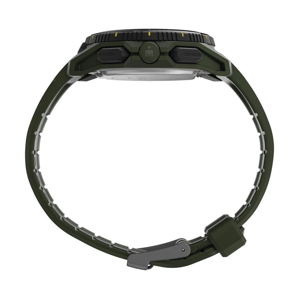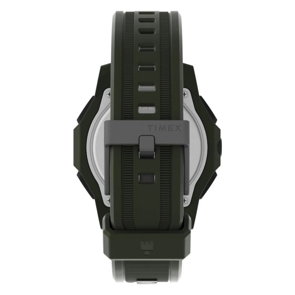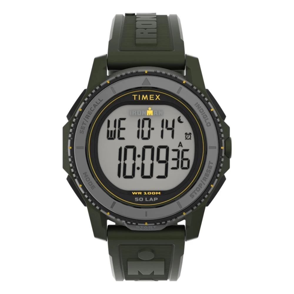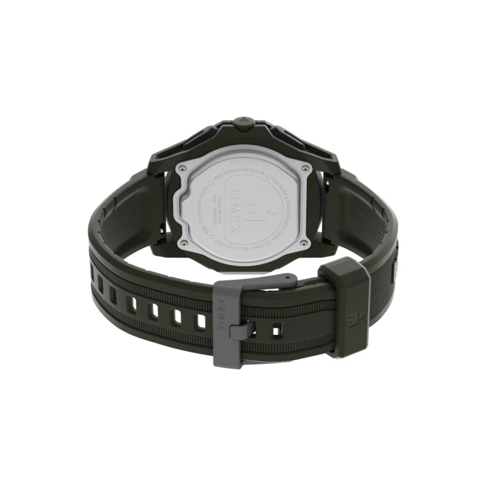 Funções: Digital, Iluminação (Indiglo Night Light), Calendário, Dual Time, Cronógrafo com memória para 50 voltas, Alarme, Timer, Sinal Horário OpcionalResistência à Água: 100mDiâmetro da Caixa: 47 mmCaracterísticas: com caixa em Resina Verde/Preta e pulseira em Poliuretano VerdeVidro: AcrílicoFundo ParafusadoAlimentação do maquinário: BateriaMostrador Preto com detalhes em LaranjaLinha: Timex IronmanGarantia de 1 Ano
