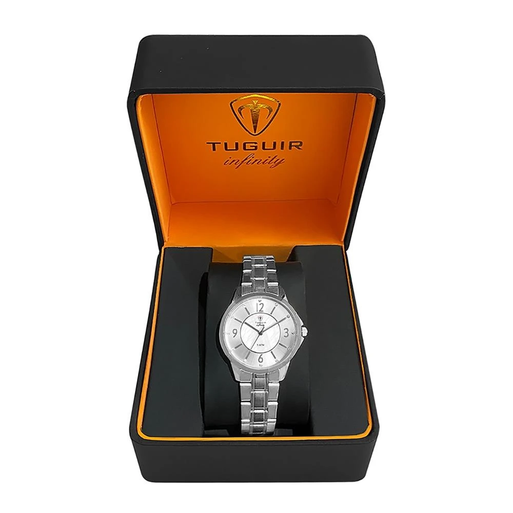 Funções: AnalógicoResistência à Água: 50mDiâmetro da Caixa: 34 mmCaracterísticas: com caixa em Aço e pulseira em AçoVidro: Cristal MineralFundo RosqueadoAlimentação do maquinário: BateriaMostrador Prateado com números, pedras e detalhe estilo madreperola brancoLinha: Tuguir InfinityGarantia de 1 Ano