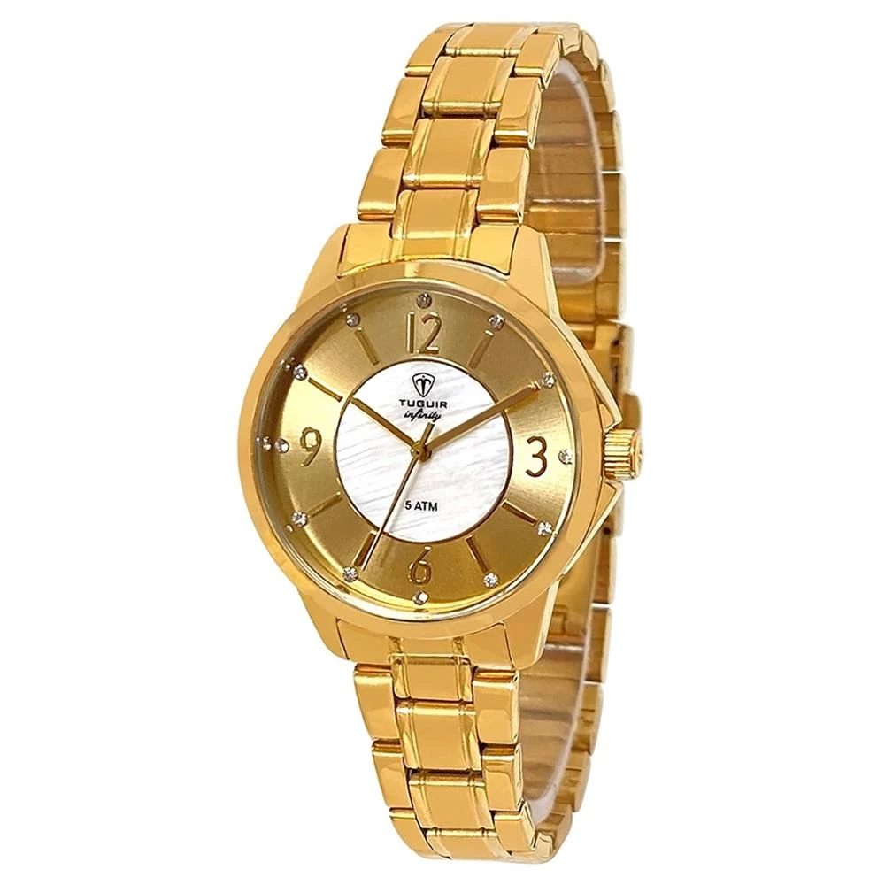 Funções: AnalógicoResistência à Água: 50mDiâmetro da Caixa: 34 mmCaracterísticas: com caixa em Aço e pulseira em AçoVidro: Cristal MineralFundo RosqueadoAlimentação do maquinário: BateriaMostrador Dourado com números, pedras e detalhe estilo madreperola brancoLinha: Tuguir InfinityGarantia de 1 Ano