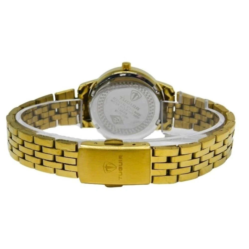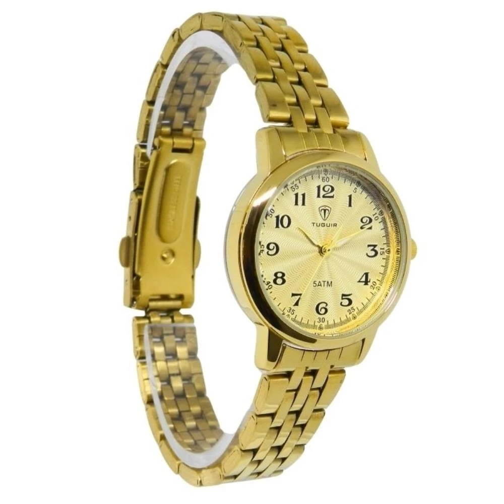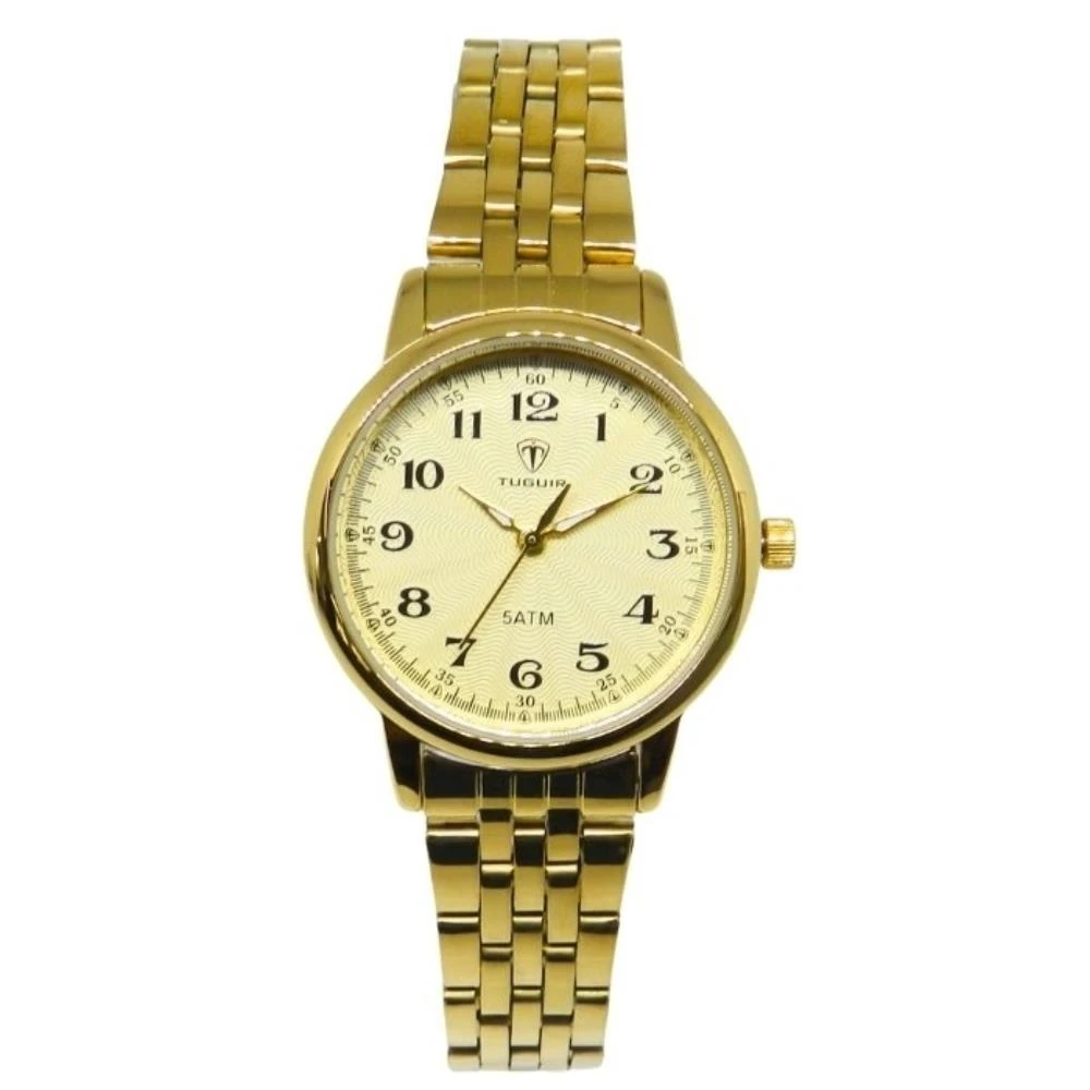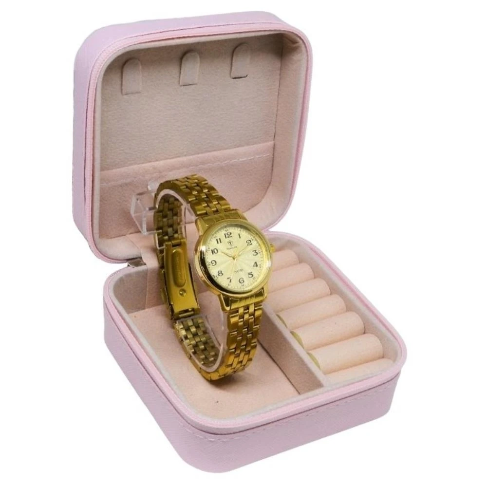 Funções: AnalógicoResistência à Água: 50mDiâmetro da Caixa: 30 mmCaracterísticas: com caixa em Metal e pulseira em AçoVidro: Cristal MineralFundo RosqueadoAlimentação do maquinário: BateriaMostrador Dourado com Todos os NúmerosMaquinário japonês+ Estojo Porta JóiasGarantia de 1 Ano