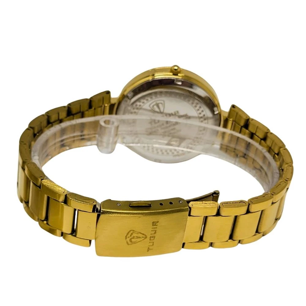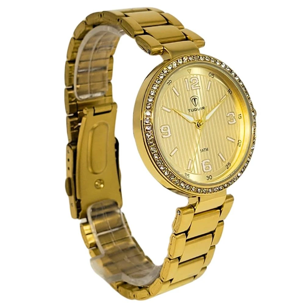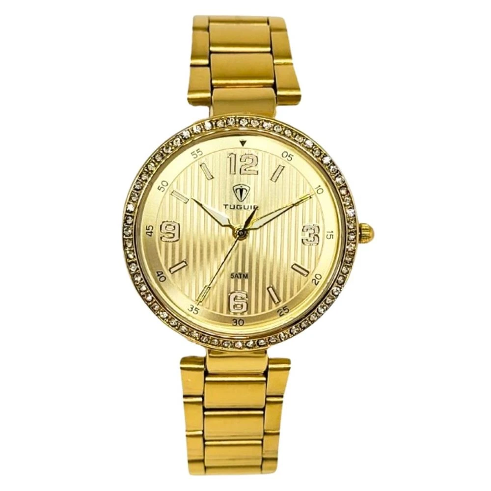Funções: AnalógicoResistência à Água: 50mDiâmetro da Caixa: 37 mmCaracterísticas: com caixa em Metal e pulseira em AçoVidro: Cristal MineralFundo RosqueadoAlimentação do maquinário: BateriaMostrador Dourado com NúmerosAro Externo de pedrasMaquinário japonês+ Estojo Porta JóiasGarantia de 1 Ano