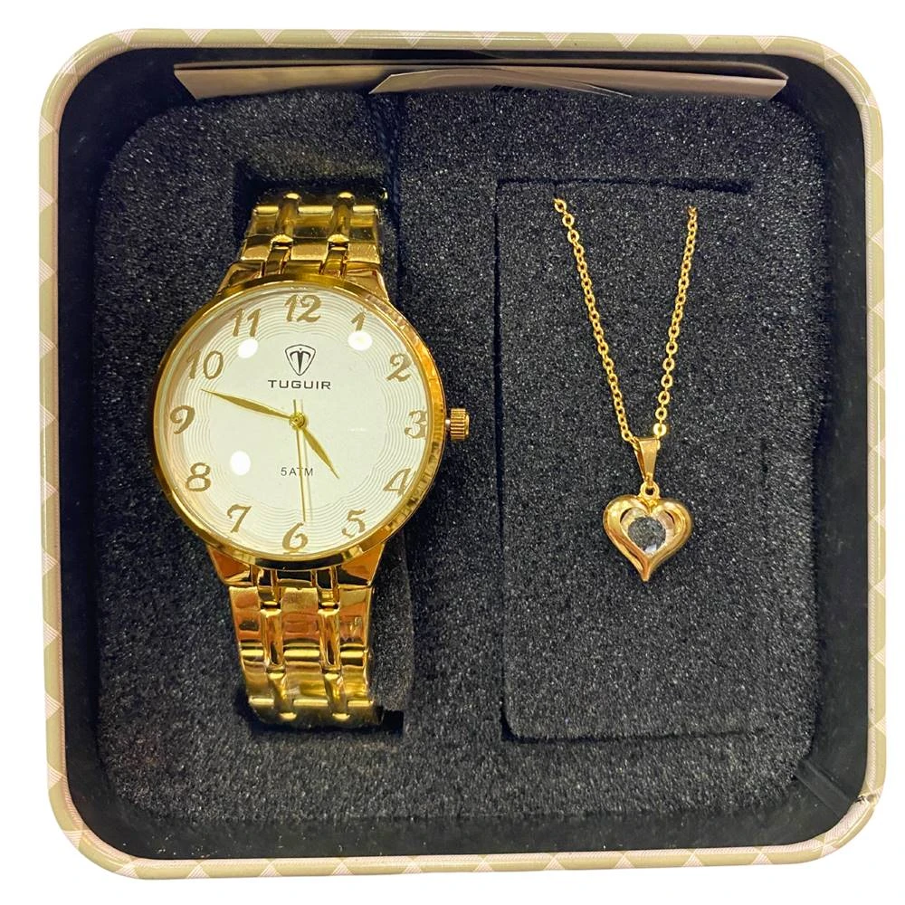 Funções: AnalógicoResistência à Água: 50mDiâmetro da Caixa: 39 mmCaracterísticas: com caixa em Metal e pulseira em AçoVidro: Cristal MineralFundo RosqueadoAlimentação do maquinário: BateriaMostrador Prateado com Todos os Números+ Corrente e Pingente SemijoiaGarantia de 1 Ano