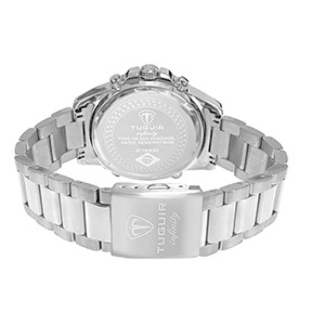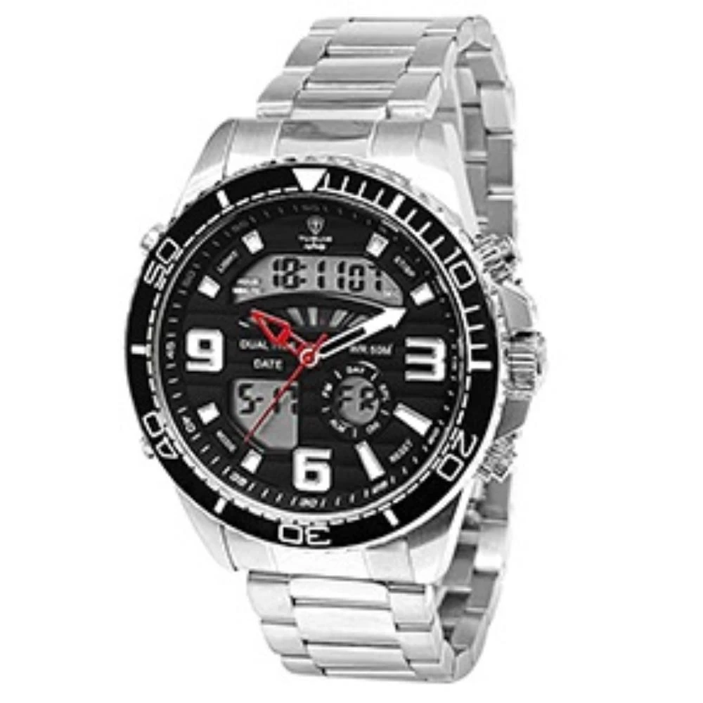Funções: Anadigi, Cronometro, Data, Alarme, IluminaçãoResistência à Água: 50mDiâmetro da Caixa: 47 mmCaracterísticas: com caixa em Aço e pulseira em AçoVidro: Cristal MineralFundo RosqueadoAlimentação do maquinário: BateriaMostrador Preto com númerosAro Preto FixoLinha: Tuguir InfinityGarantia de 1 Ano
