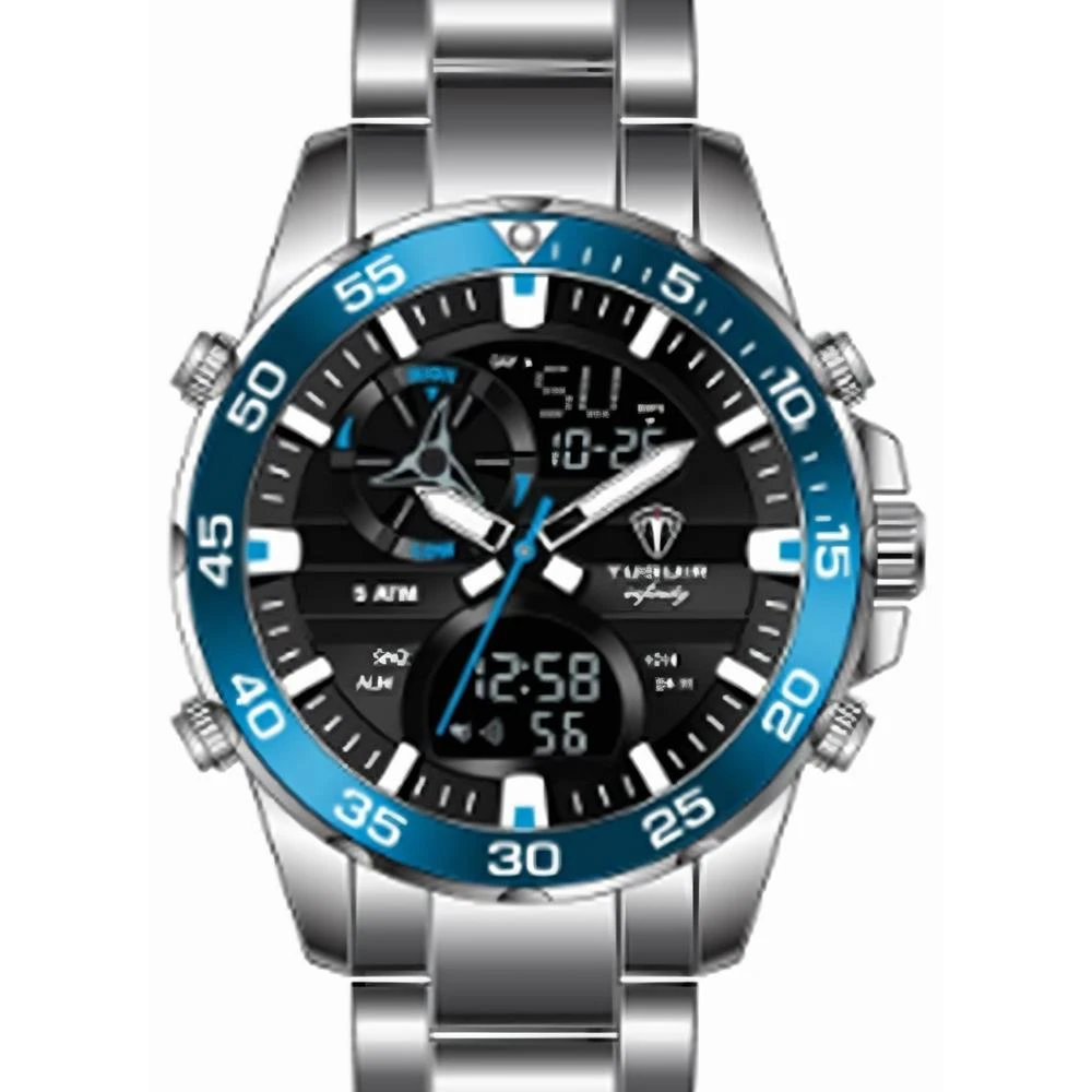Funções: Anadigi, Cronometro, Data, Alarme, IluminaçãoResistência à Água: 50mDiâmetro da Caixa: 47 mmCaracterísticas: com caixa em Aço e pulseira em AçoVidro: Cristal MineralFundo RosqueadoAlimentação do maquinário: BateriaMostrador PretoAro Azul FixoLinha: Tuguir InfinityGarantia de 1 Ano