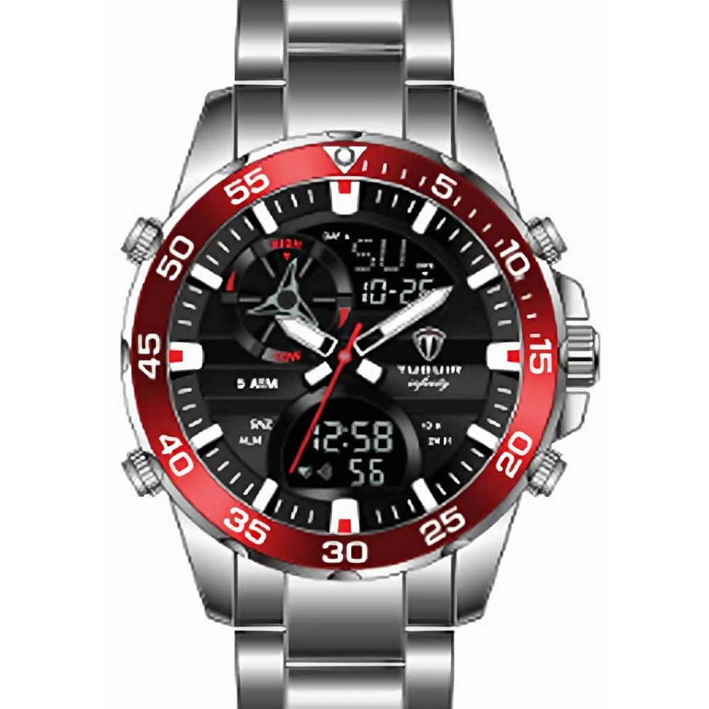 Funções: Anadigi, Cronometro, Data, Alarme, IluminaçãoResistência à Água: 50mDiâmetro da Caixa: 47 mmCaracterísticas: com caixa em Aço e pulseira em AçoVidro: Cristal MineralFundo RosqueadoAlimentação do maquinário: BateriaMostrador PretoAro Vermelho FixoLinha: Tuguir InfinityGarantia de 1 Ano
