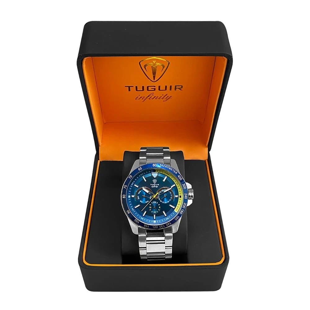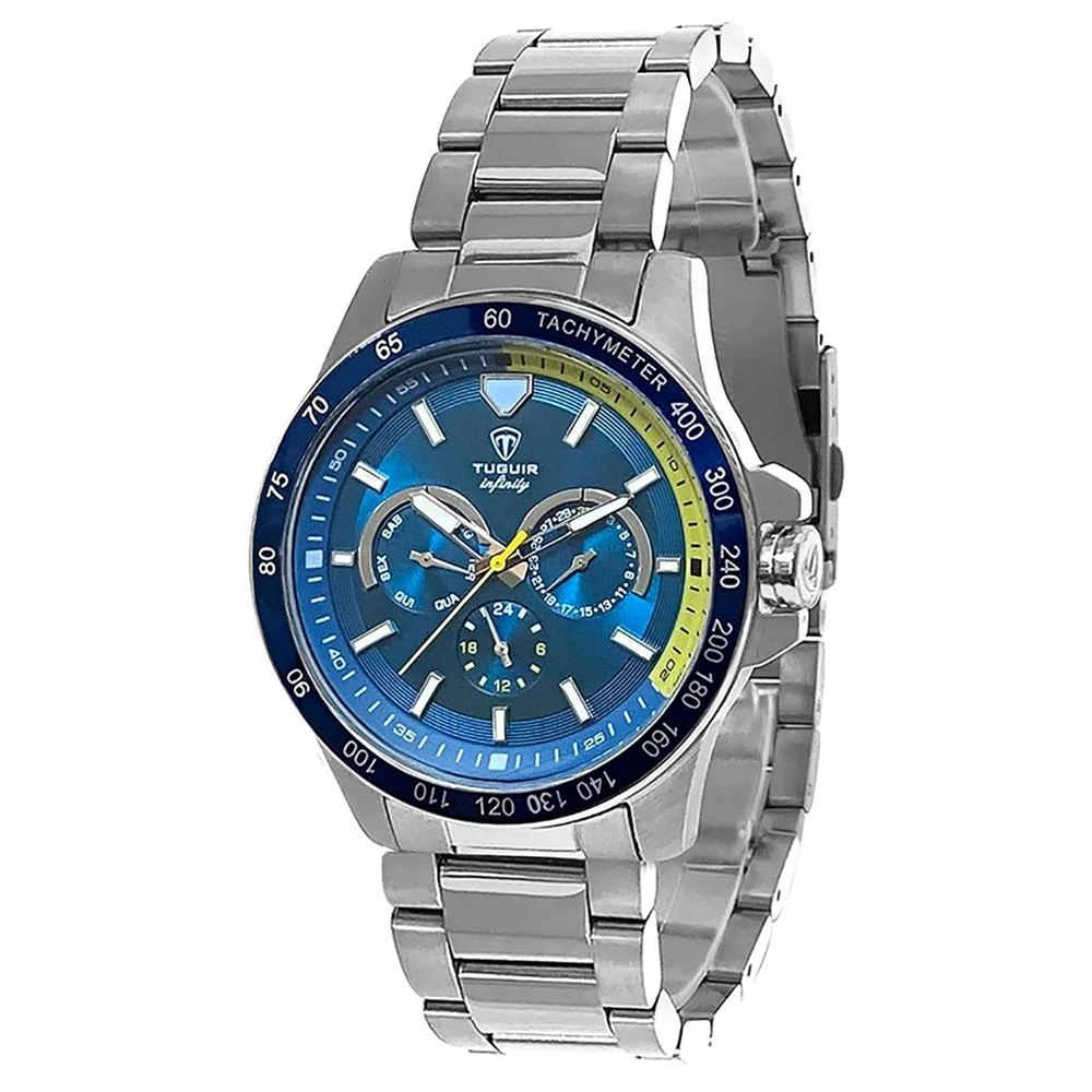 Funções: Analógico, Multifunção (Calendários Mensal e Semanal e Horário em 24h)Resistência à Água: 50mDiâmetro da Caixa: 45 mmCaracterísticas: com caixa em Aço e pulseira em AçoVidro: Cristal MineralFundo RosqueadoAlimentação do maquinário: BateriaMostrador Azul com detalhe em amareloAro Azul FixoLinha: Tuguir InfinityGarantia de 1 Ano