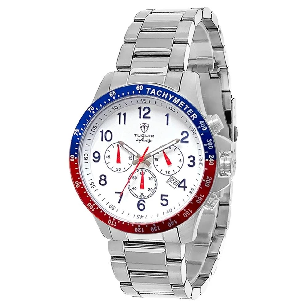 Funções: Analógico, Cronógrafo, CalendárioResistência à Água: 50mDiâmetro da Caixa: 45 mmCaracterísticas: com caixa em Aço e pulseira em AçoVidro: Cristal MineralFundo RosqueadoAlimentação do maquinário: BateriaMostrador Branco com todos os númerosAro Azul e Vermelho FixoLinha: Tuguir Infinity+ Pulseira Extra de Silicone Azul (Com pino de alavanca para facilitar a troca da pulseira)Garantia de 1 Ano