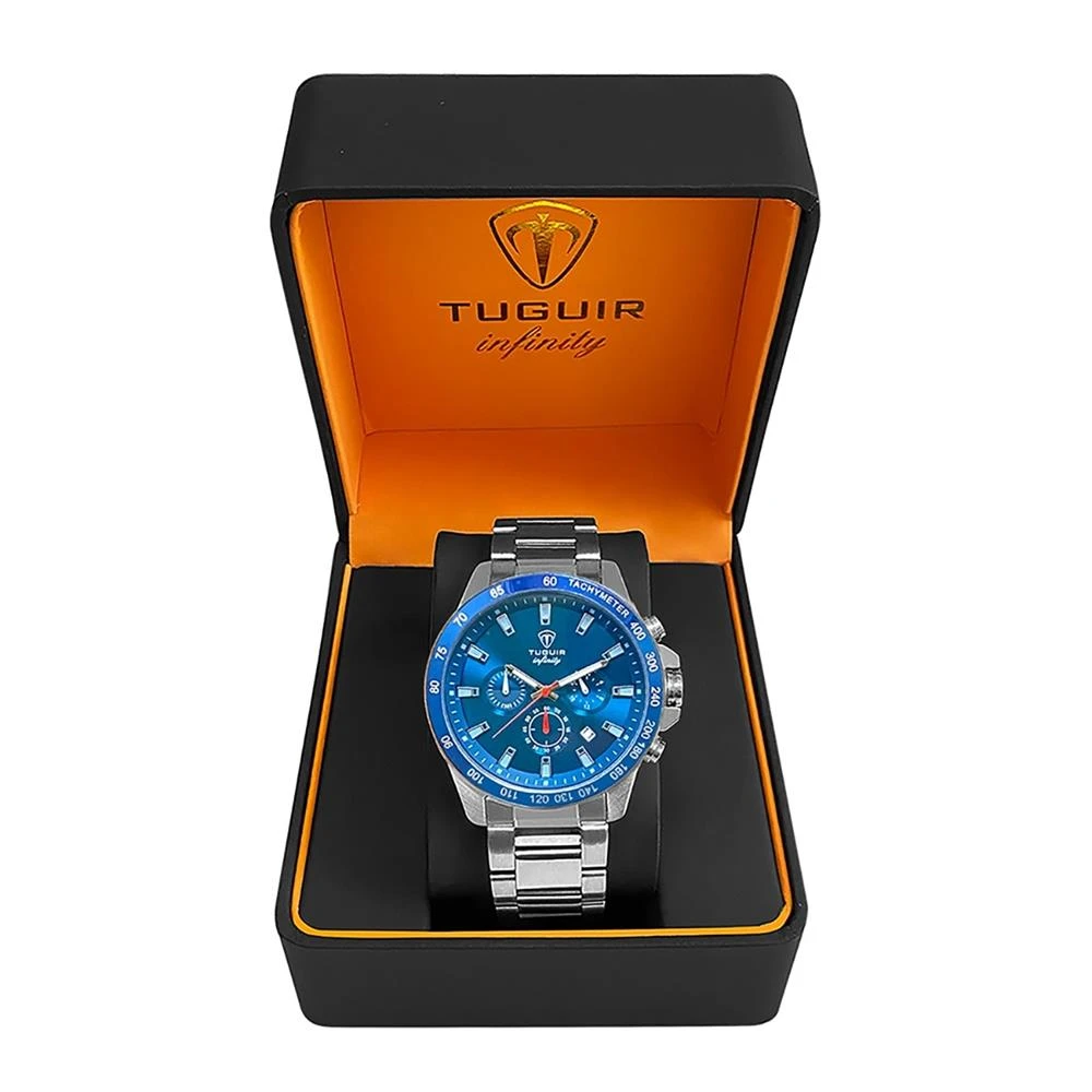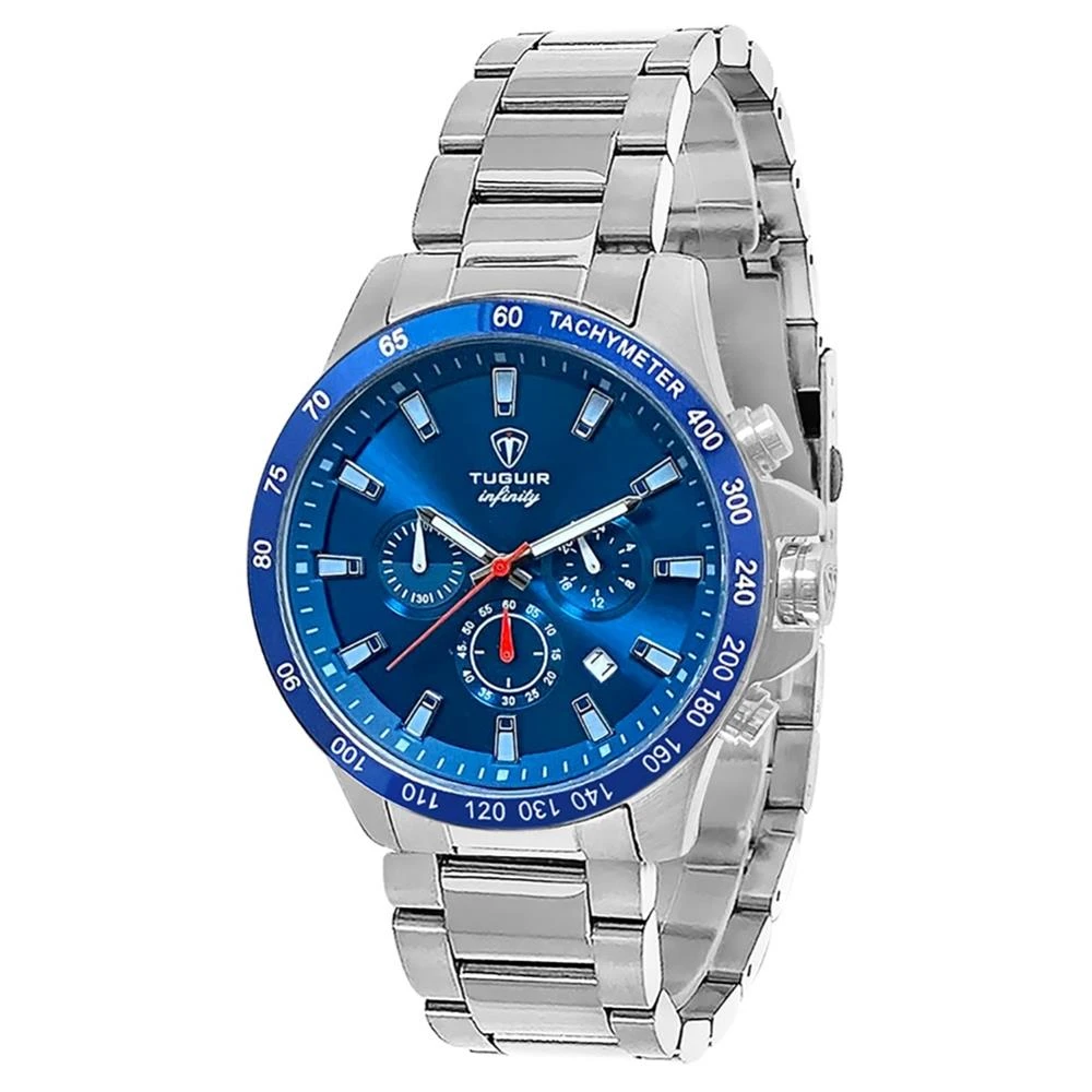 Funções: Analógico, Cronógrafo, CalendárioResistência à Água: 50mDiâmetro da Caixa: 45 mmCaracterísticas: com caixa em Aço e pulseira em AçoVidro: Cristal MineralFundo RosqueadoAlimentação do maquinário: BateriaMostrador AzulAro Azul FixoLinha: Tuguir InfinityGarantia de 1 Ano