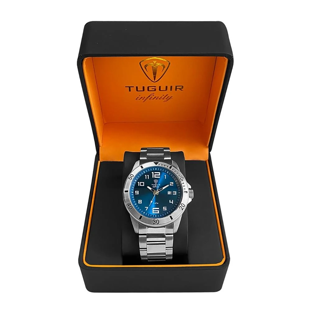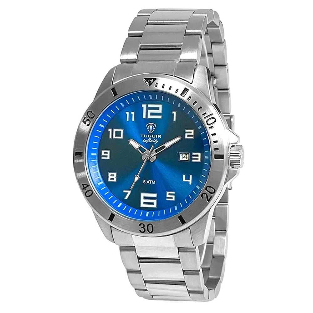 Funções: Analógico, CalendárioResistência à Água: 50mDiâmetro da Caixa: 43 mmCaracterísticas: com caixa em Aço e pulseira em AçoVidro: Cristal MineralFundo RosqueadoAlimentação do maquinário: BateriaMostrador Azul com todos os númerosLinha: Tuguir InfinityGarantia de 1 Ano