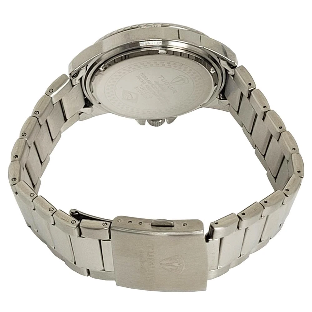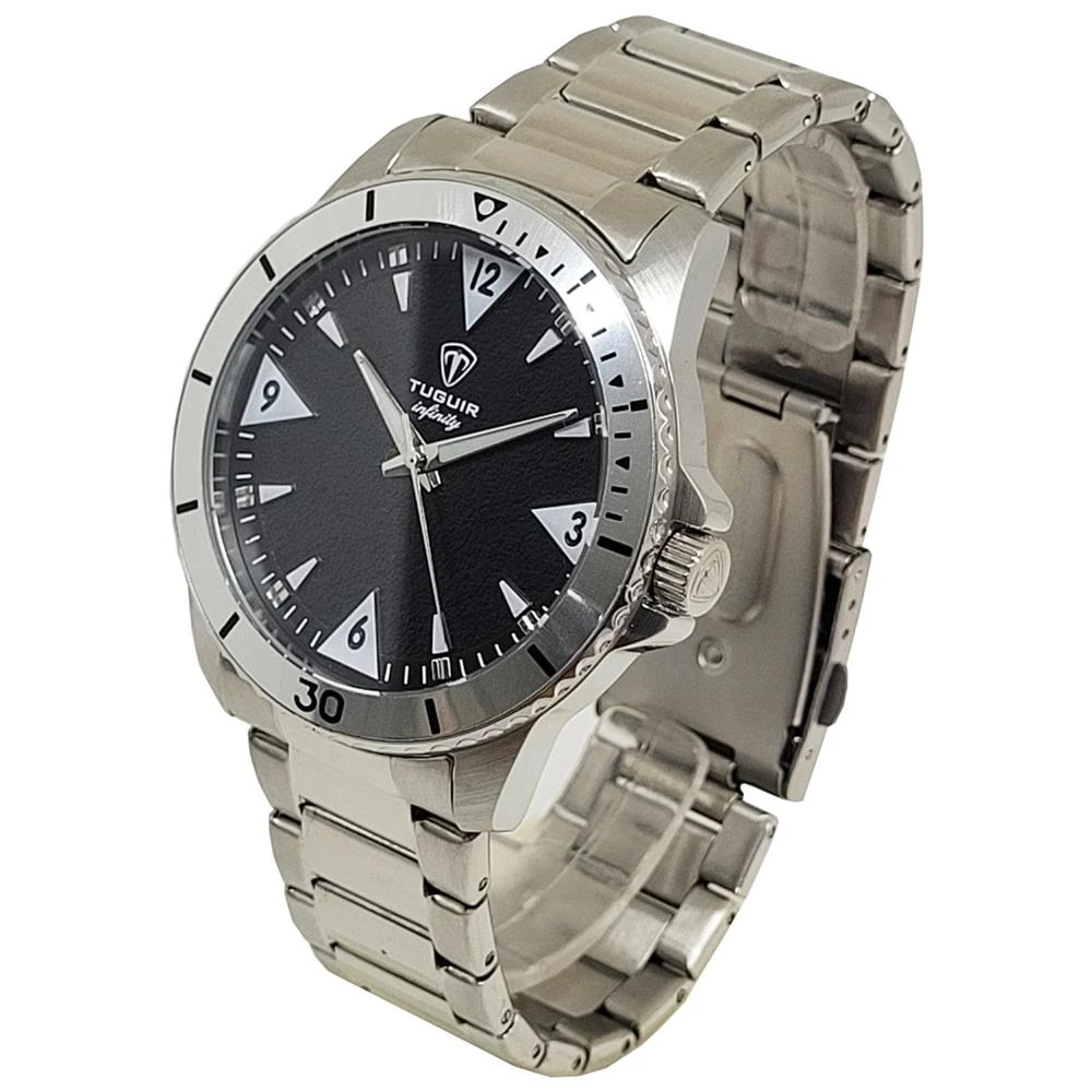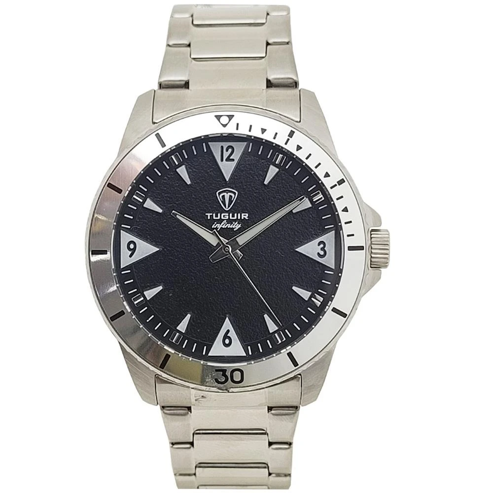 Funções: AnalógicoResistência à Água: 50mDiâmetro da Caixa: 43 mmCaracterísticas: com caixa em Aço e pulseira em AçoVidro: Cristal MineralFundo RosqueadoAlimentação do maquinário: BateriaMostrador Preto com númerosAro Fixo PrateadoLinha: Tuguir InfinityGarantia de 1 Ano