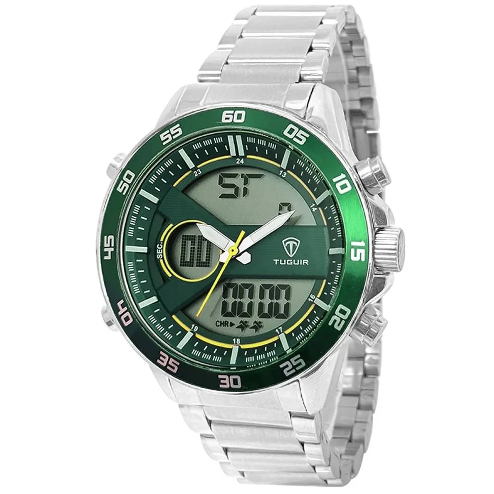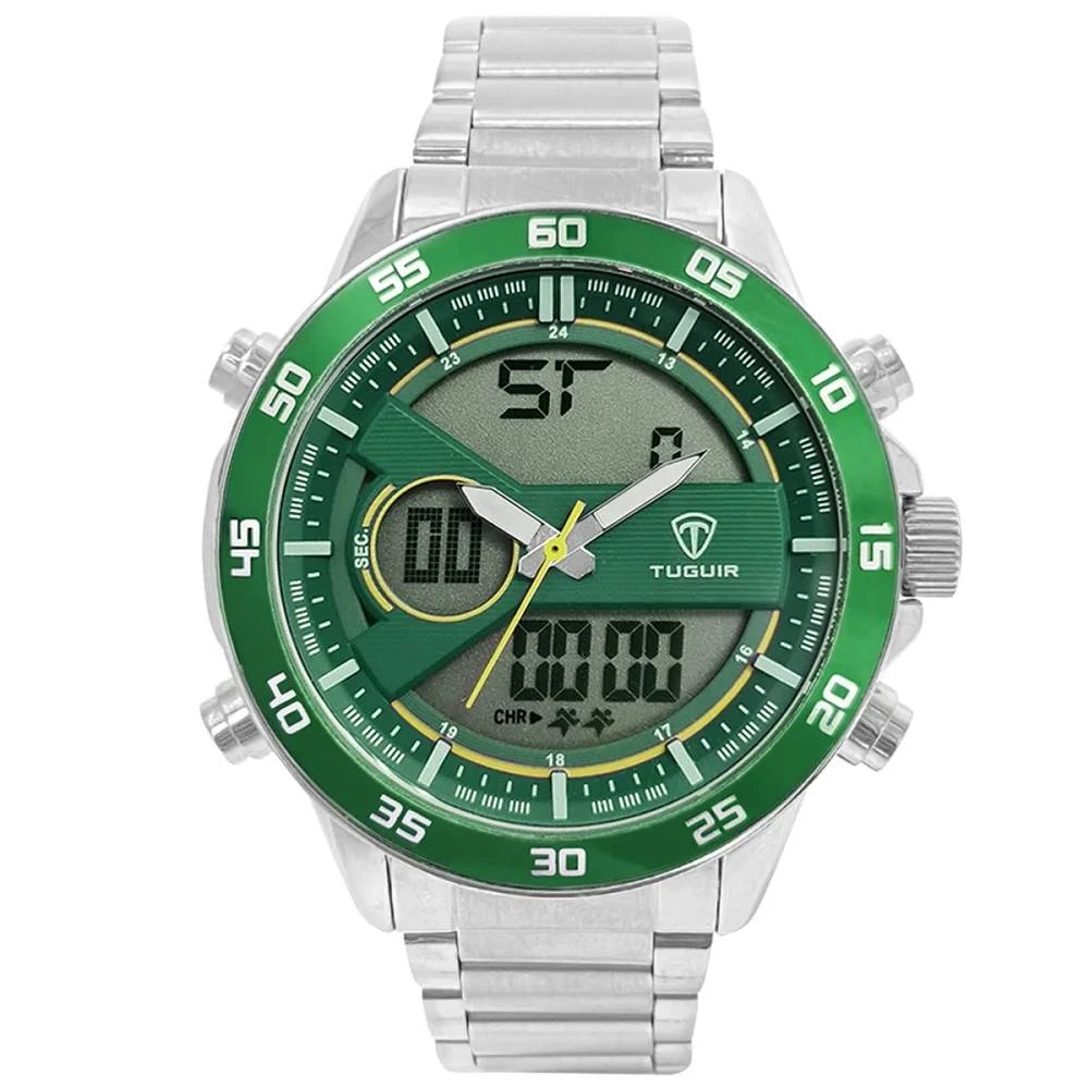 Funções: Anadigi, Iluminação, Calendário, Alarme, CronógrafoResistência à Água: 50mDiâmetro da Caixa: 46 mmCaracterísticas: com caixa em Metal e pulseira em AçoVidro: Cristal MineralFundo de PressãoAlimentação do maquinário: BateriaMostrador VerdeGarantia de 1 Ano