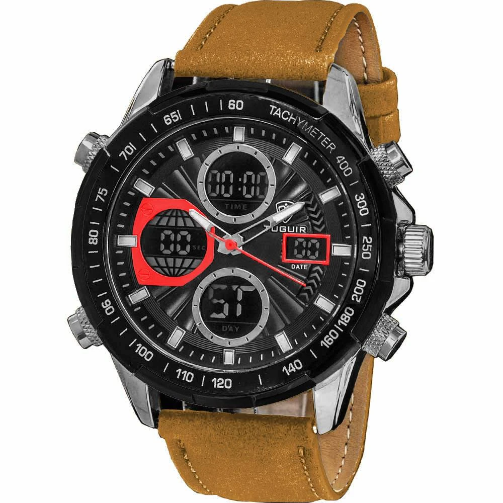 Funções: Anadigi, Iluminação, Calendário, Alarme, CronógrafoResistência à Água: 50mDiâmetro da Caixa: 46 mmCaracterísticas: com caixa em Metal e pulseira em Couro Ecológico CarameloVidro: Cristal MineralFundo de PressãoAlimentação do maquinário: BateriaMostrador GrafiteGarantia de 1 Ano